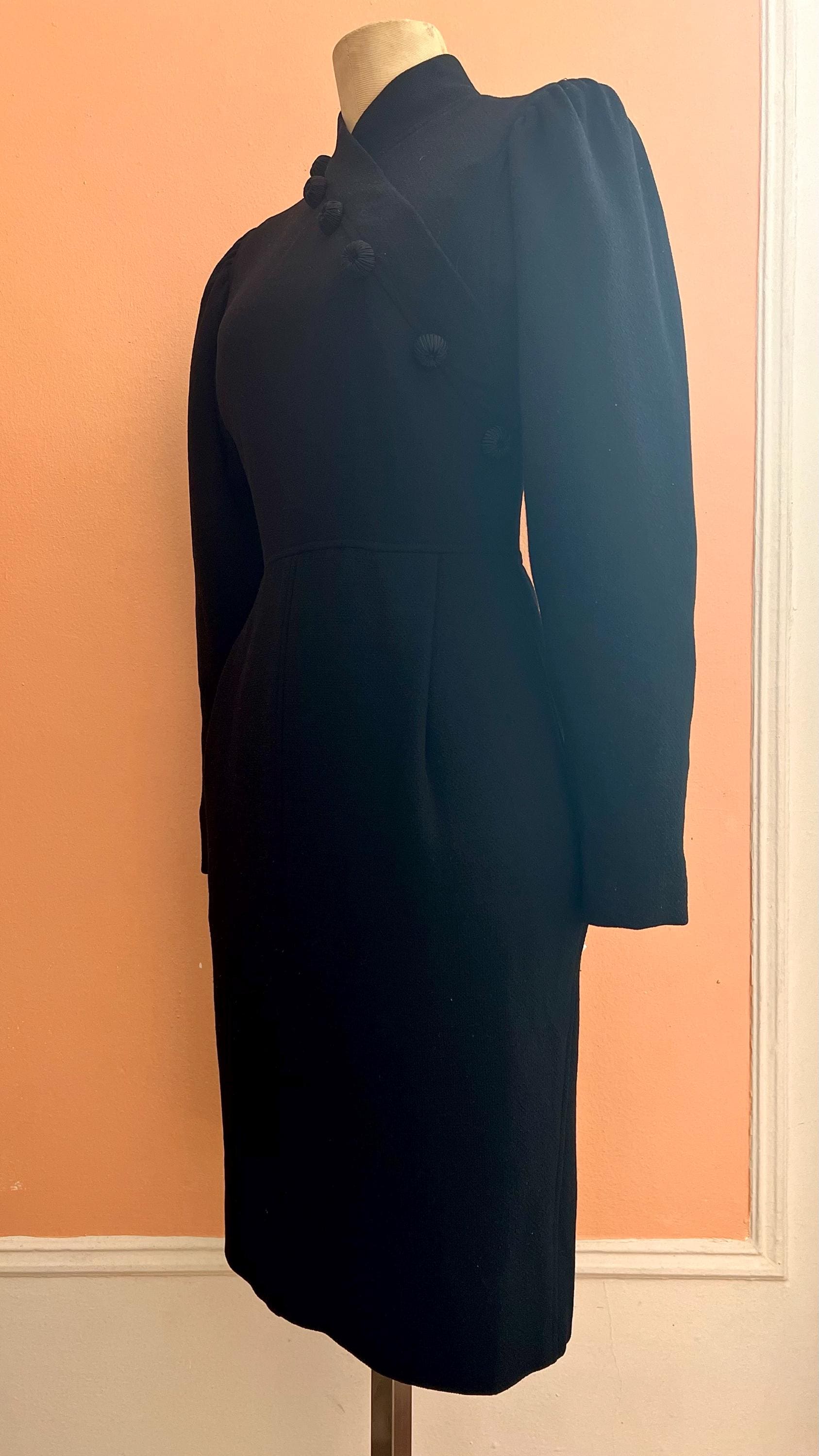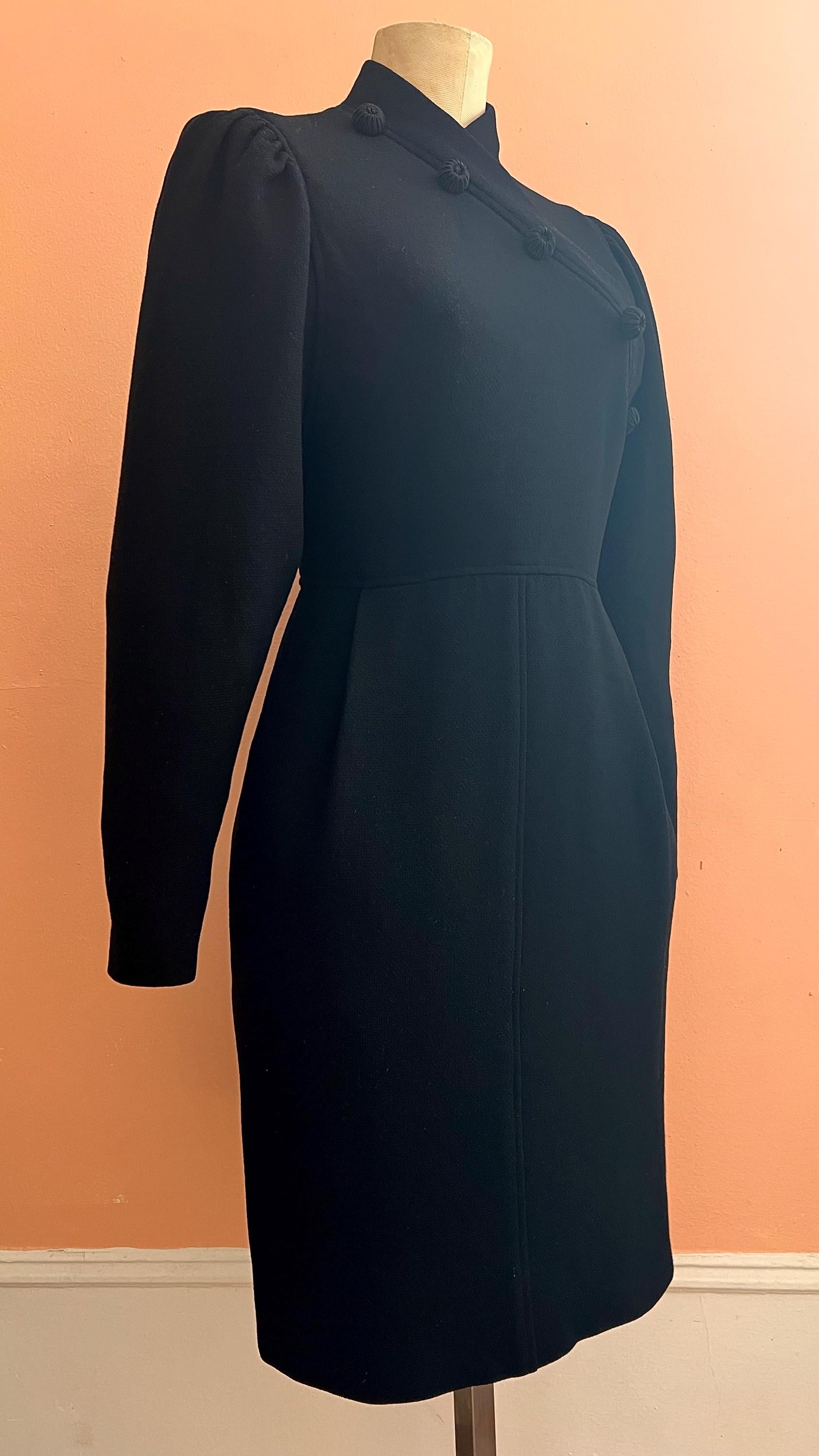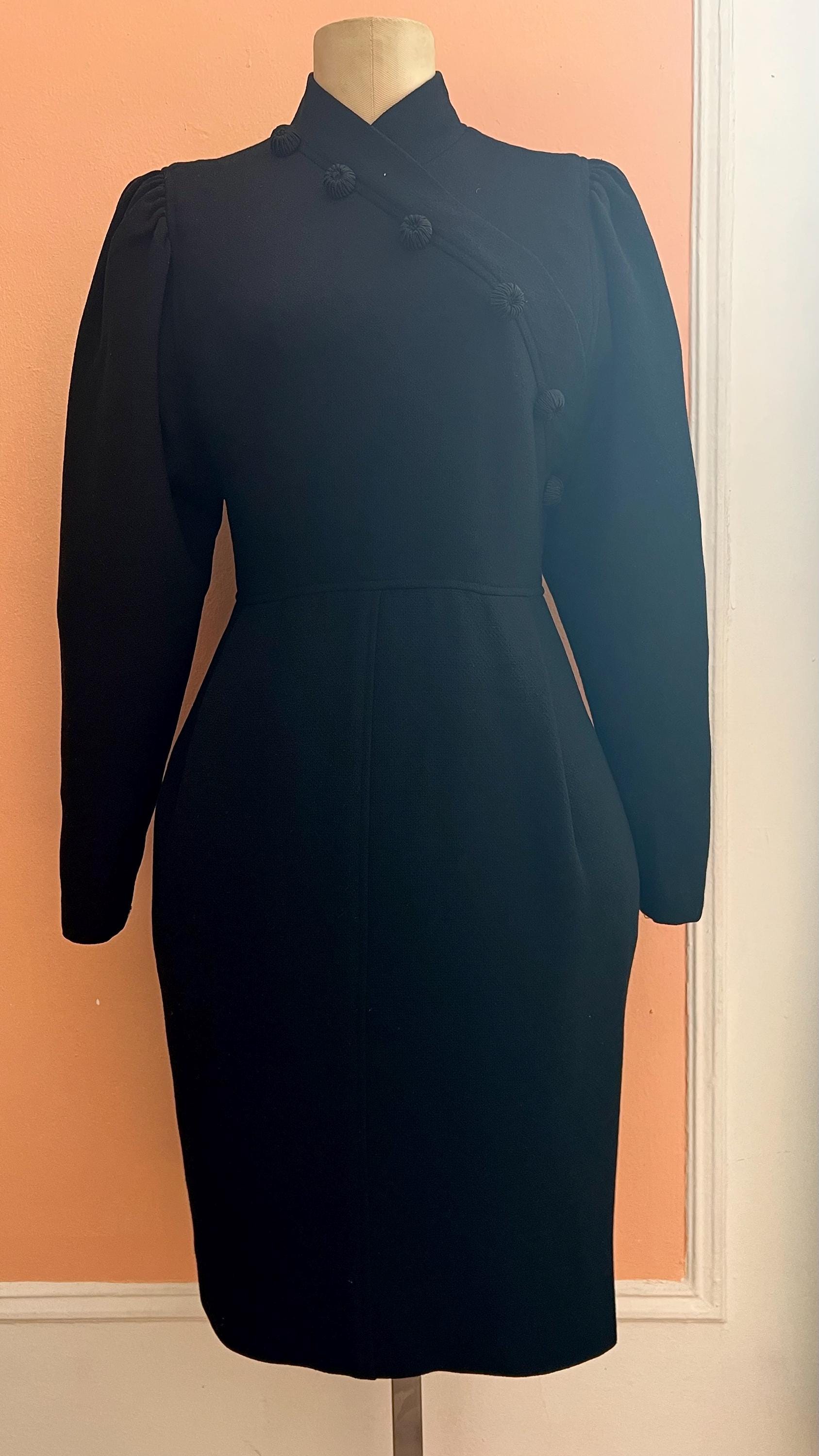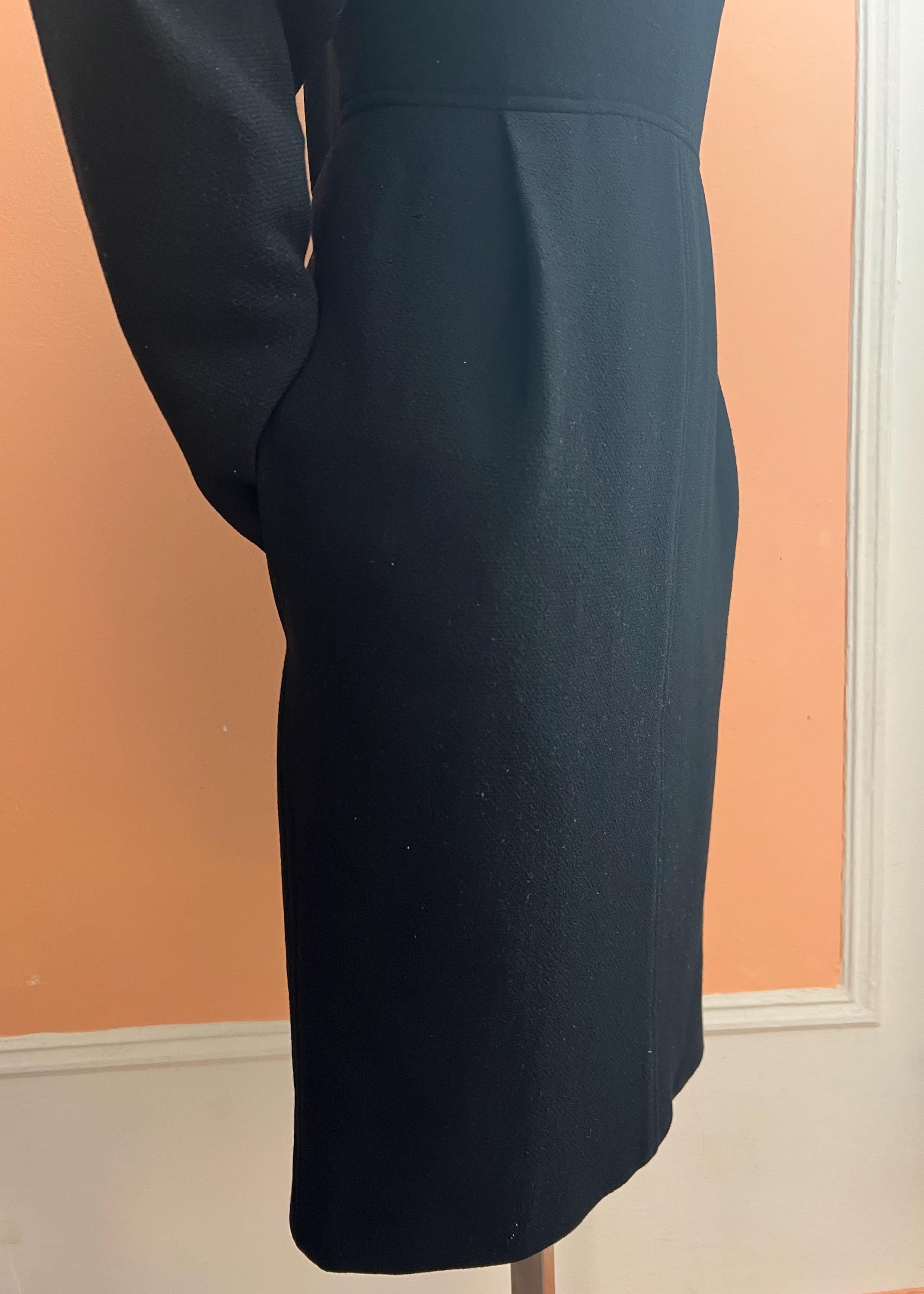A timeless, architecturally tailored dress by iconic designer Oscar de la Renta. Circa late 1990s, early 2000s, this piece features a minimalist sheath silhouette elevated by refined details, including an asymmetrical neckline, decorative vintage cord thread buttons on bust, zippered cuffs, functional pockets, and fully lined. The fabric is substantial and structured, with the feel of heavyweight linen or wool-linen blend, giving dress a sculptural drape that holds its form beautifully. Finished with hidden back zipper and interior neck clasps, this garment reflects the impeccable craftsmanship associated with late 90s Oscar de la Renta collections. Due to its construction details and tag style, this dress may be a designer floor or showroom sample, making it a rare and collectible piece. Perfect for collectors, minimalist, or anyone drawn to understated luxury with impeccable tailoring. Please feel free to ask questions about this piece. Thank you for making a conscious decision to shop sustainable pieces of art!!