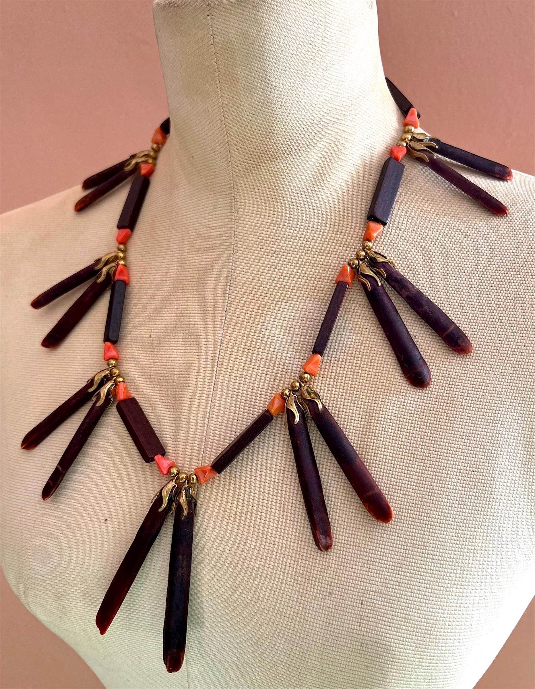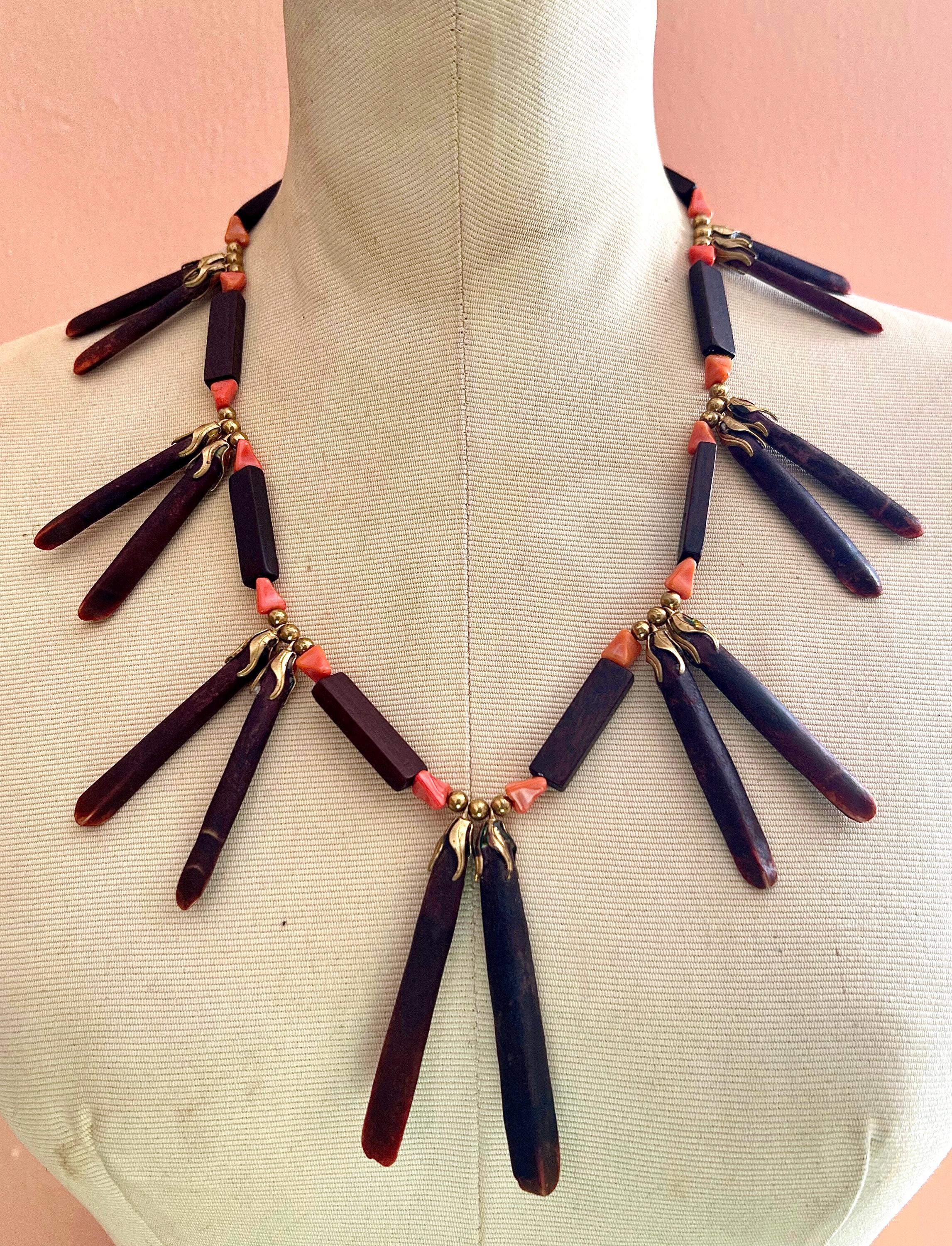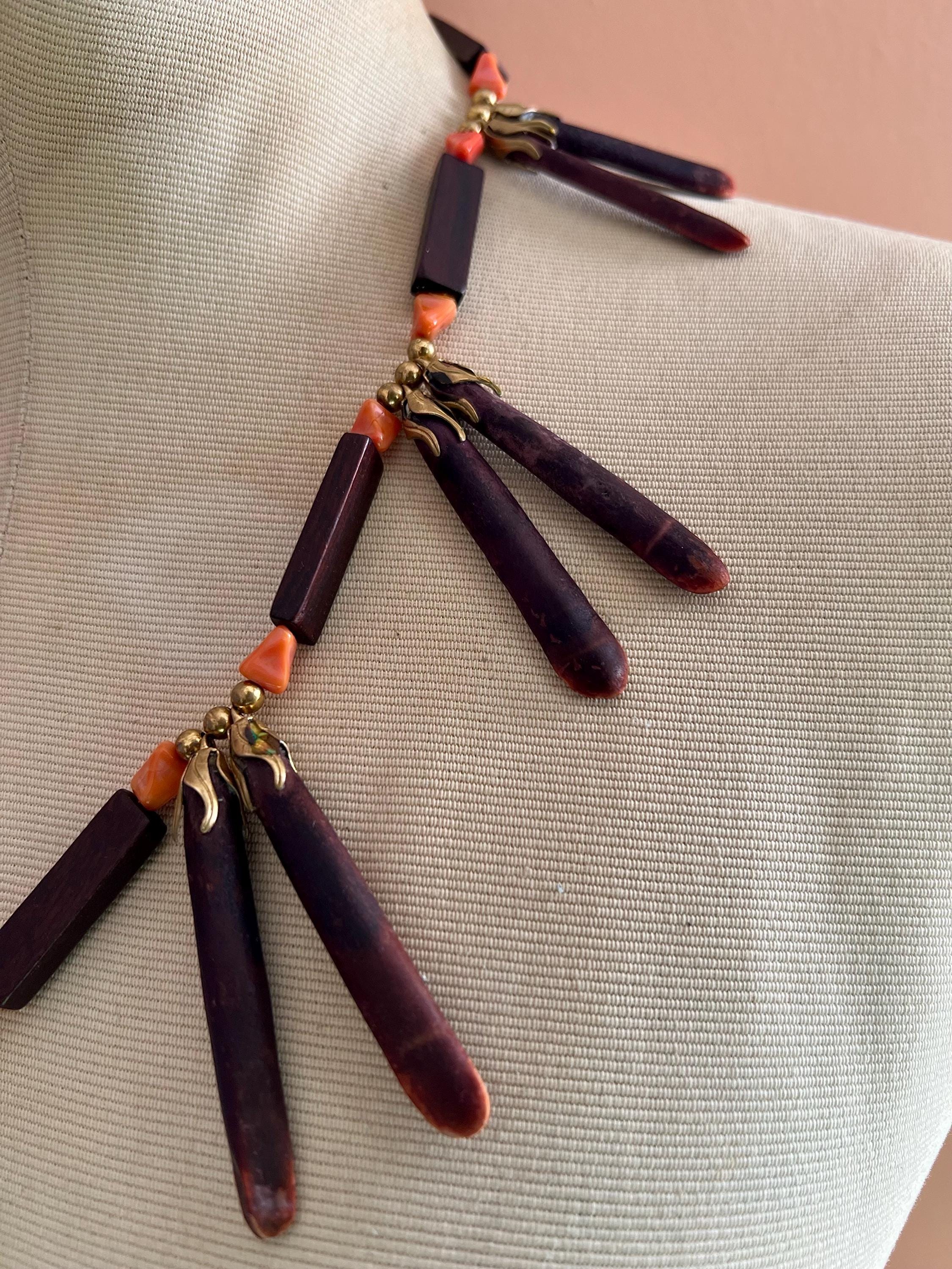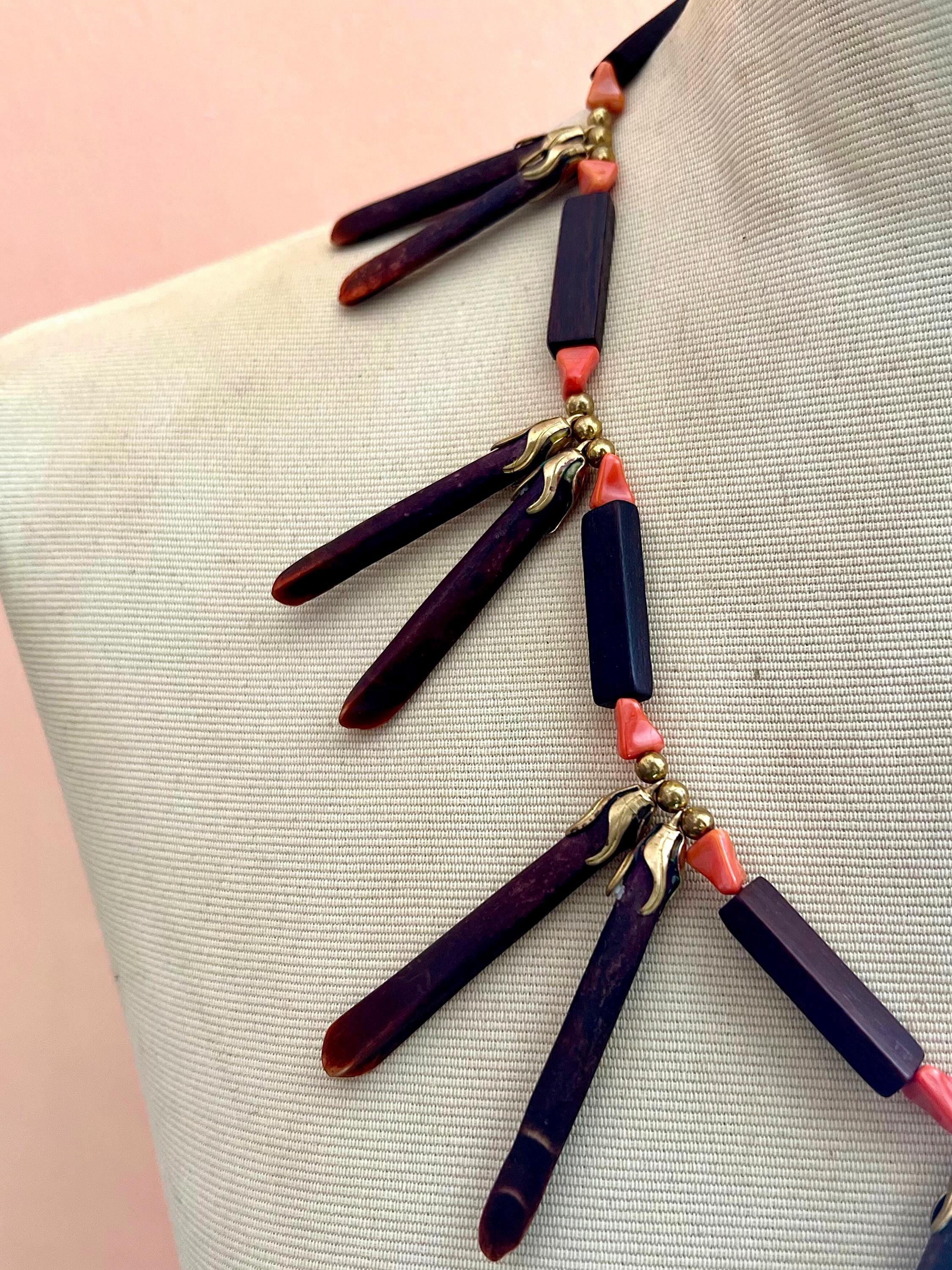 Bold, earthy, and beautifully sculptural, this vintage wooden statement necklace was made to turn heads. Each elongated oxblood-stained wooded spike is paired with faux coral beads and warm brass accents, creating a striking sunburst silhouette that rest powerfully along the collarbone. This piece balances natural textures with bohemian drama, equal parts art object and wearable design. Perfect for the creative soul who loves jewelry with presence and story. Pair effortlessly with crisp whites, linen neutrals, or a bold print. Layer with fine gold chains or wear solo for a sculptural statement moment. Perfect for maximalist dressers, collectors, and those who love global, 70s inspired design. Please feeel free to ask questions regarding this piece. Thank you for making a conscious decision to shop sustainable pieces of art!!