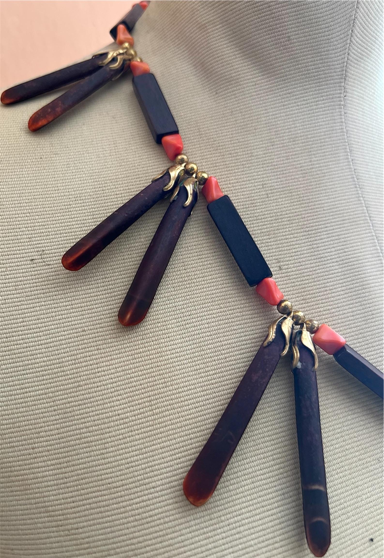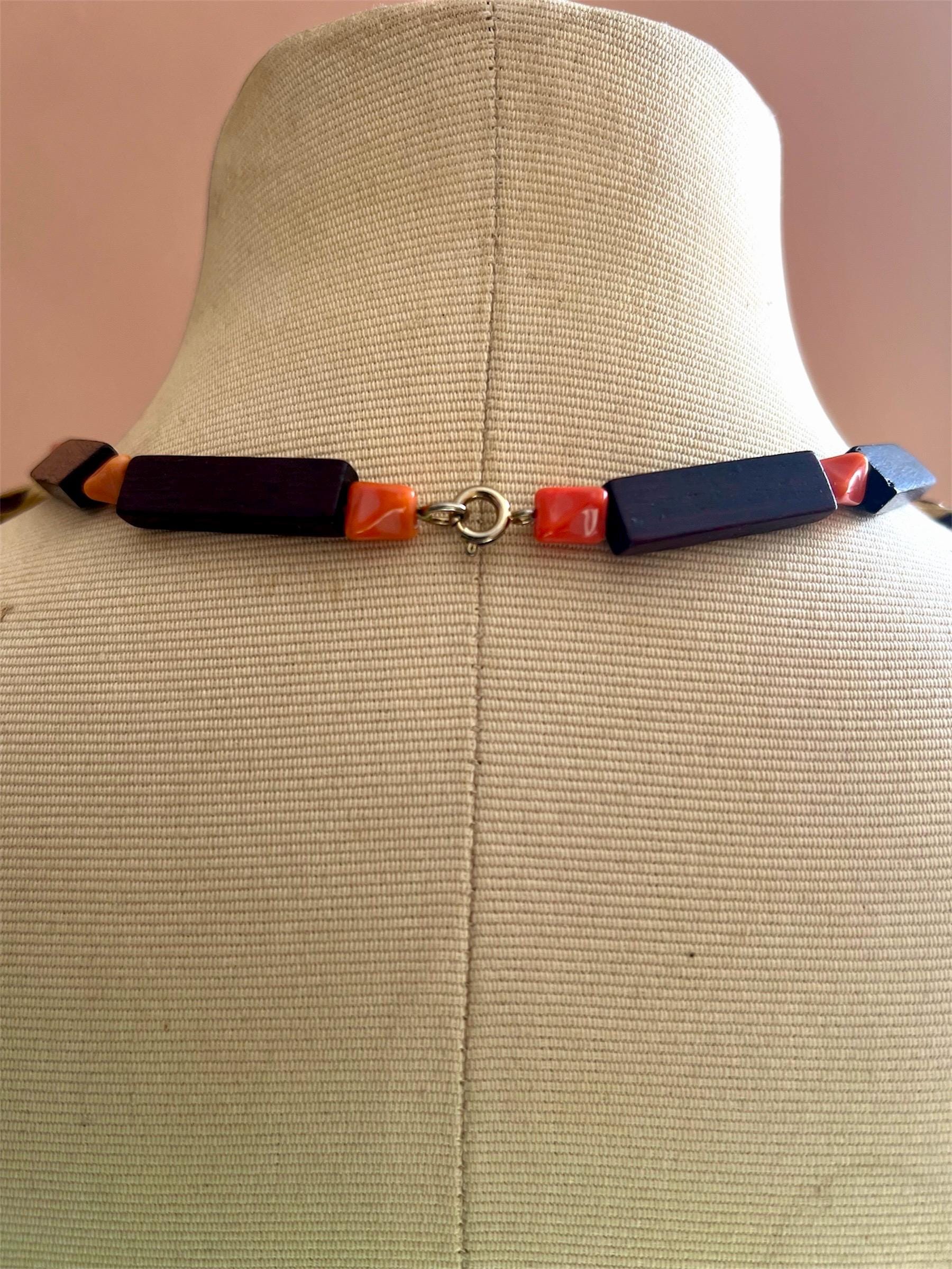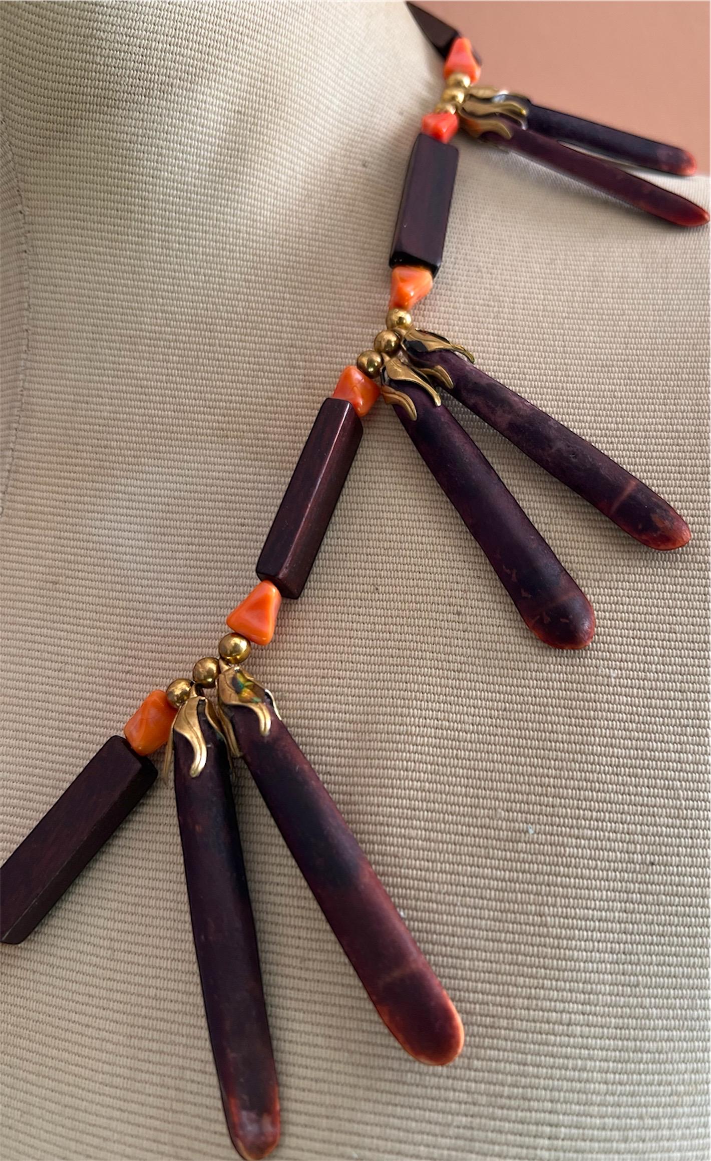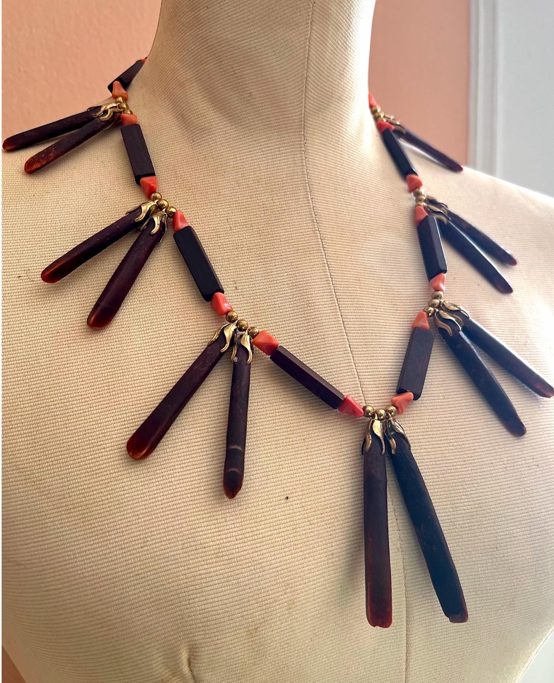 Bold, earthy, and beautifully sculptural, this vintage wooden statement necklace was made to turn heads. Each elongated oxblood-stained wooded spike is paired with faux coral beads and warm brass accents, creating a striking sunburst silhouette that rest powerfully along the collarbone. This piece balances natural textures with bohemian drama, equal parts art object and wearable design. Perfect for the creative soul who loves jewelry with presence and story. Pair effortlessly with crisp whites, linen neutrals, or a bold print. Layer with fine gold chains or wear solo for a sculptural statement moment. Perfect for maximalist dressers, collectors, and those who love global, 70s inspired design. Please feeel free to ask questions regarding this piece. Thank you for making a conscious decision to shop sustainable pieces of art!!