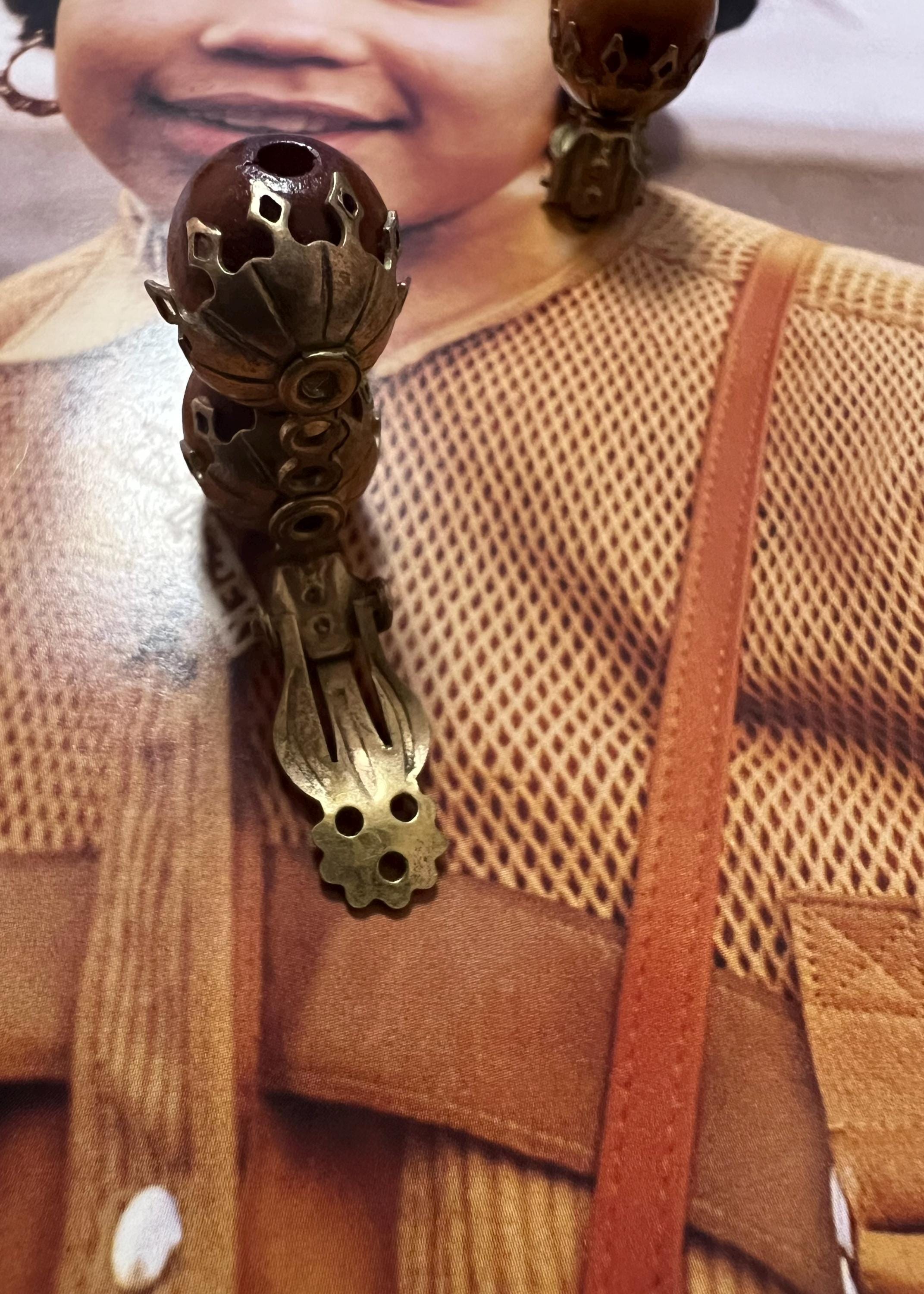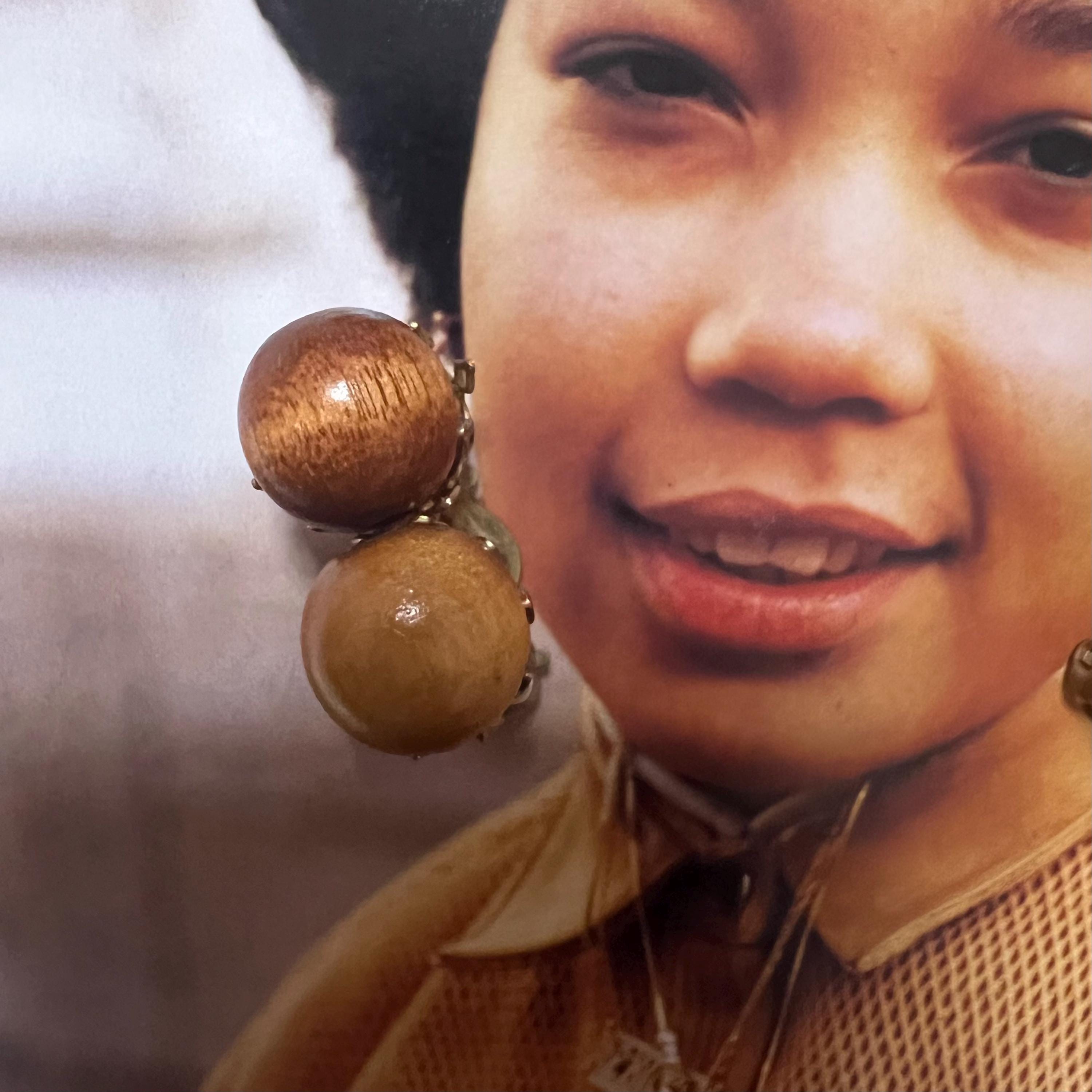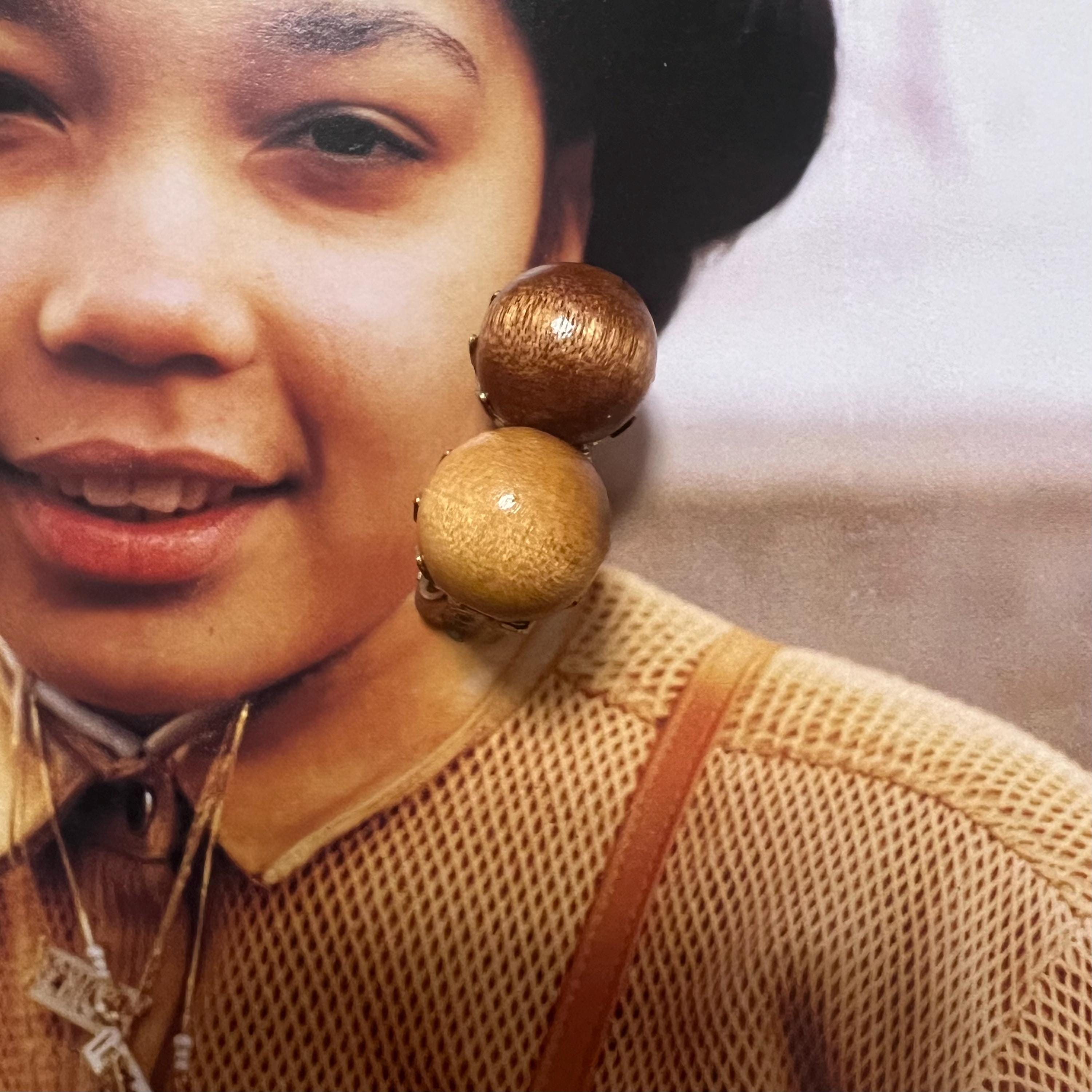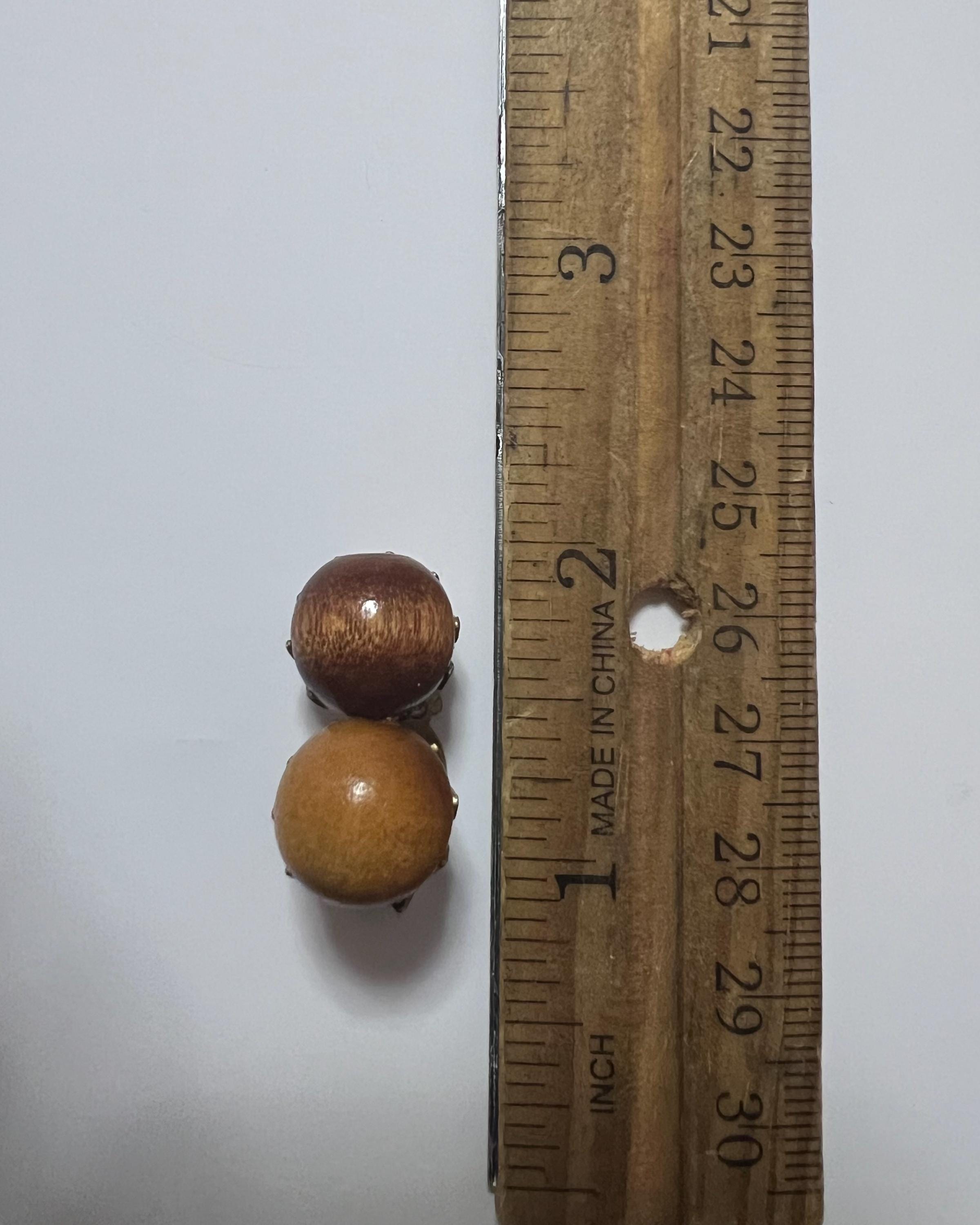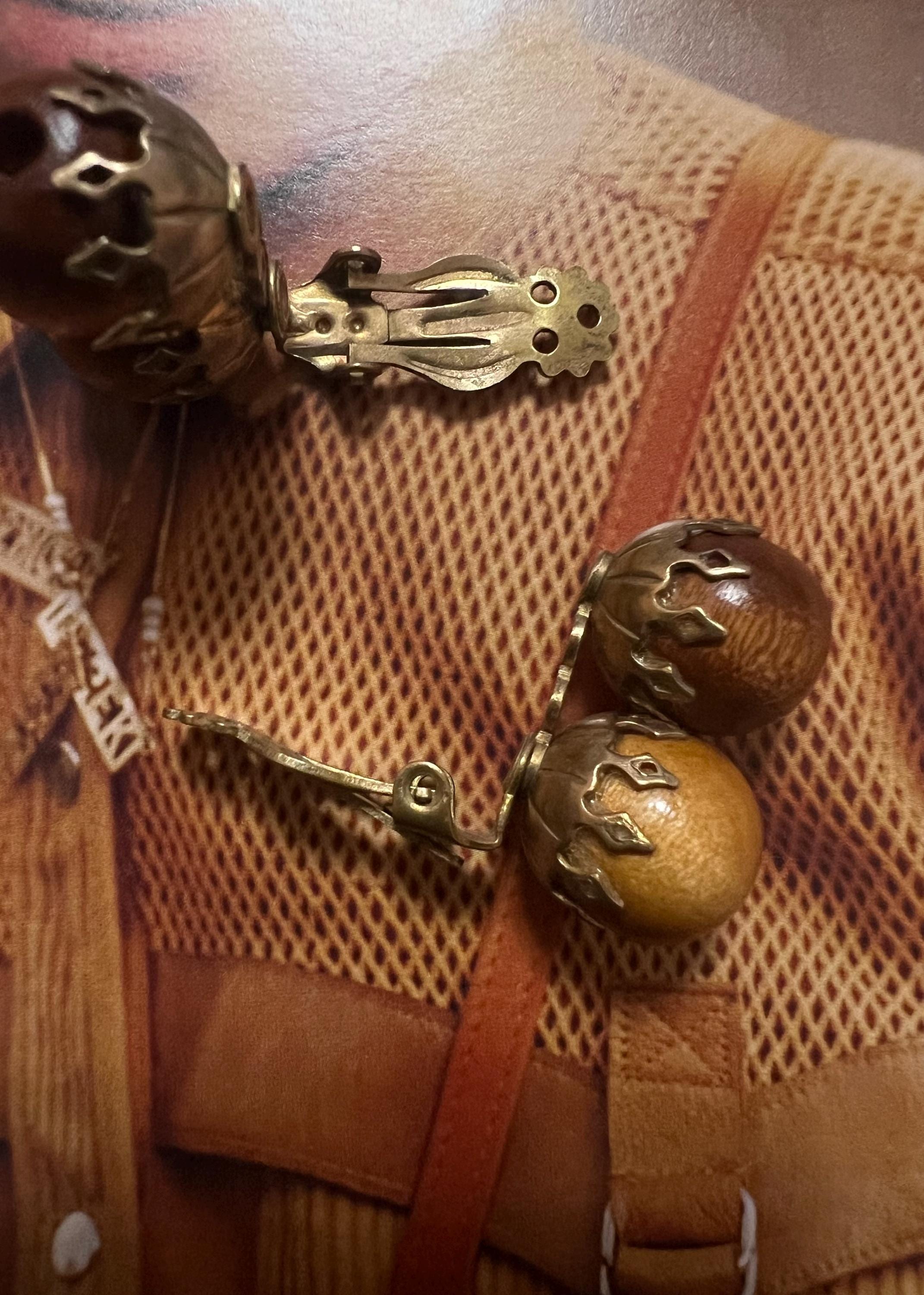 Unique artisan-style, 1970s bead drop clip-on earrings. True vintage statement piece that channels the era's love for sculptural, artistic jewelry. Features stacked orb wooden beads set in warm metallic tones. Measures 2 inches in length, these earrings bring movement, shape, and an effortless Afro-Bohemian energy to any look. Lightweight enough for everyday wear but dramatic enough for a night out. Pair beautifully with vintage denim, mesh tops, leather, or any modern wardrobe that needs a spark of retro texture. These gems have been well cared for and are in great vintage, with some signs of surface wear consistent with age.