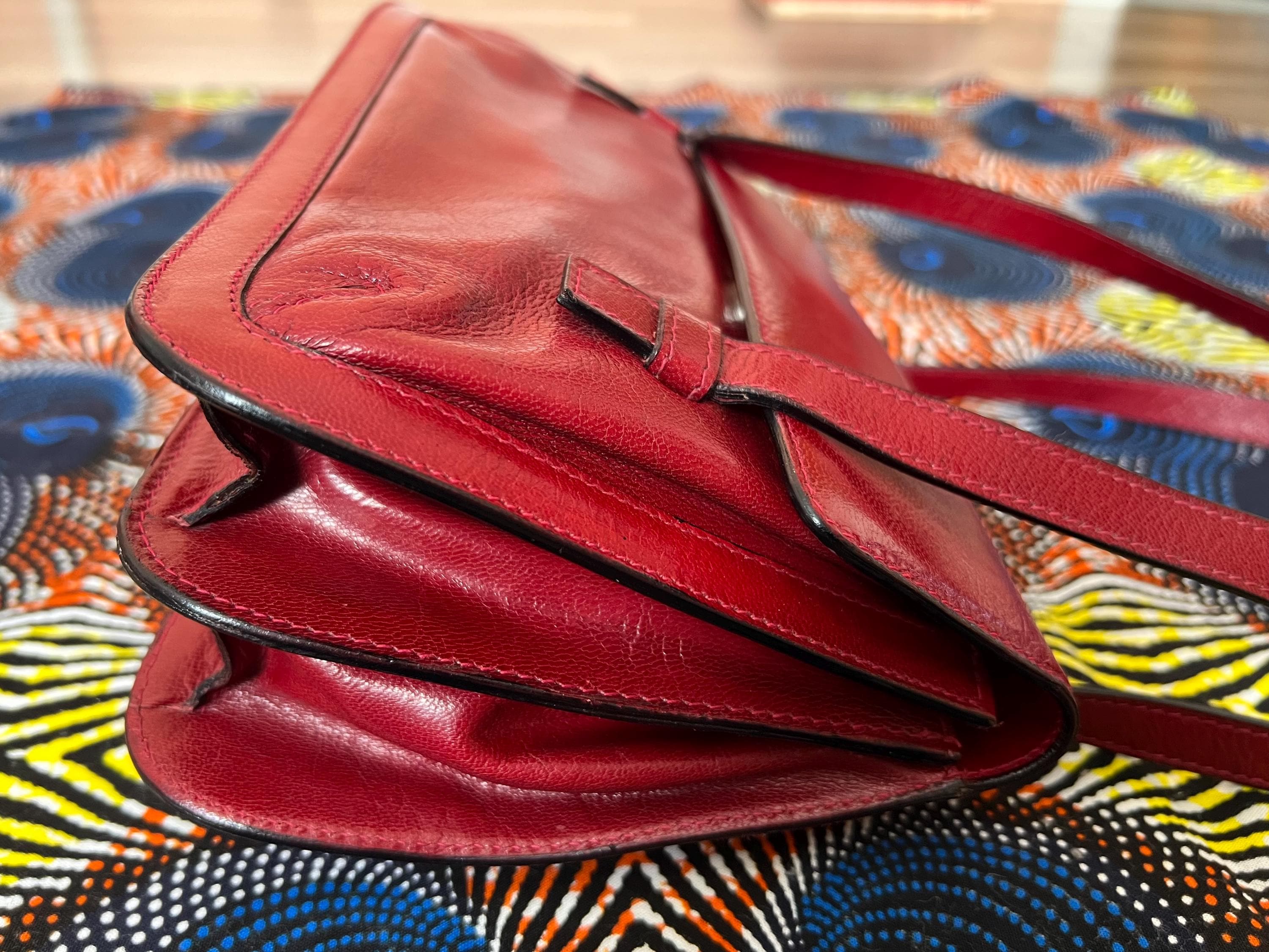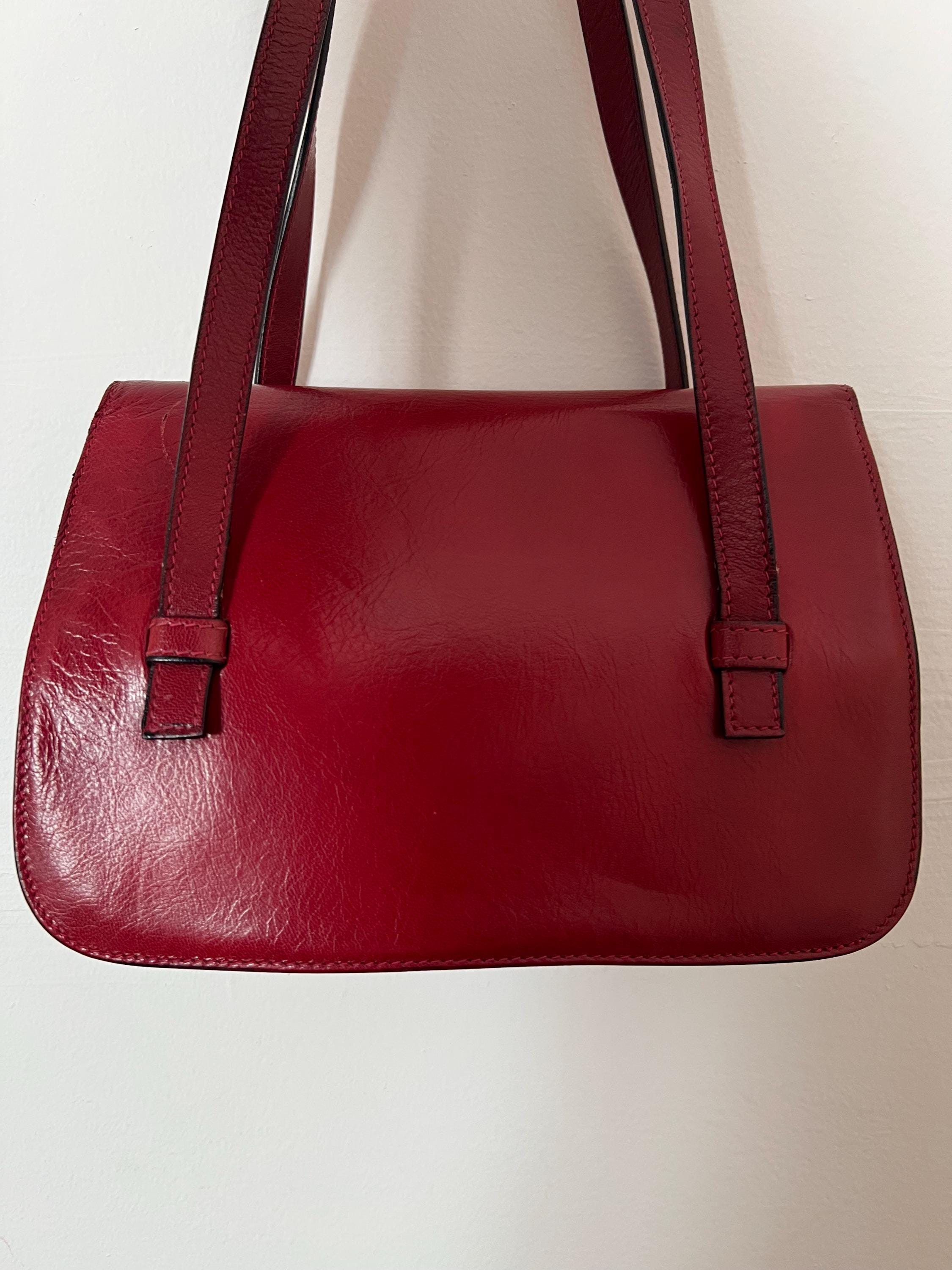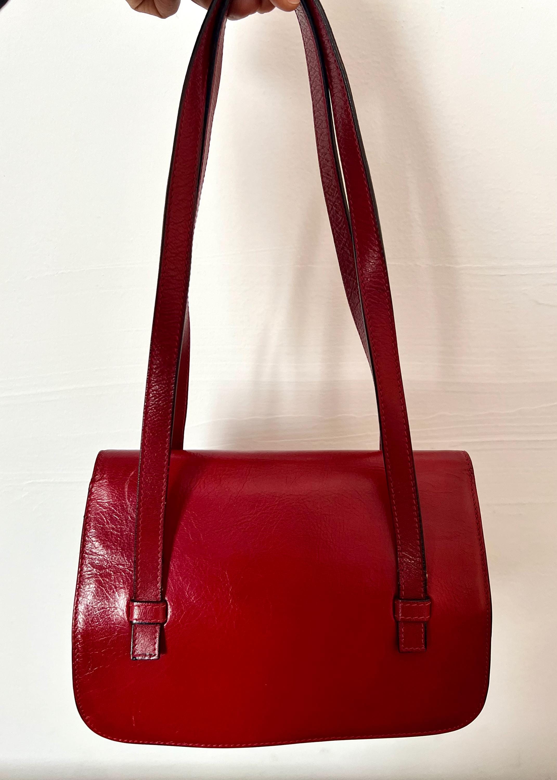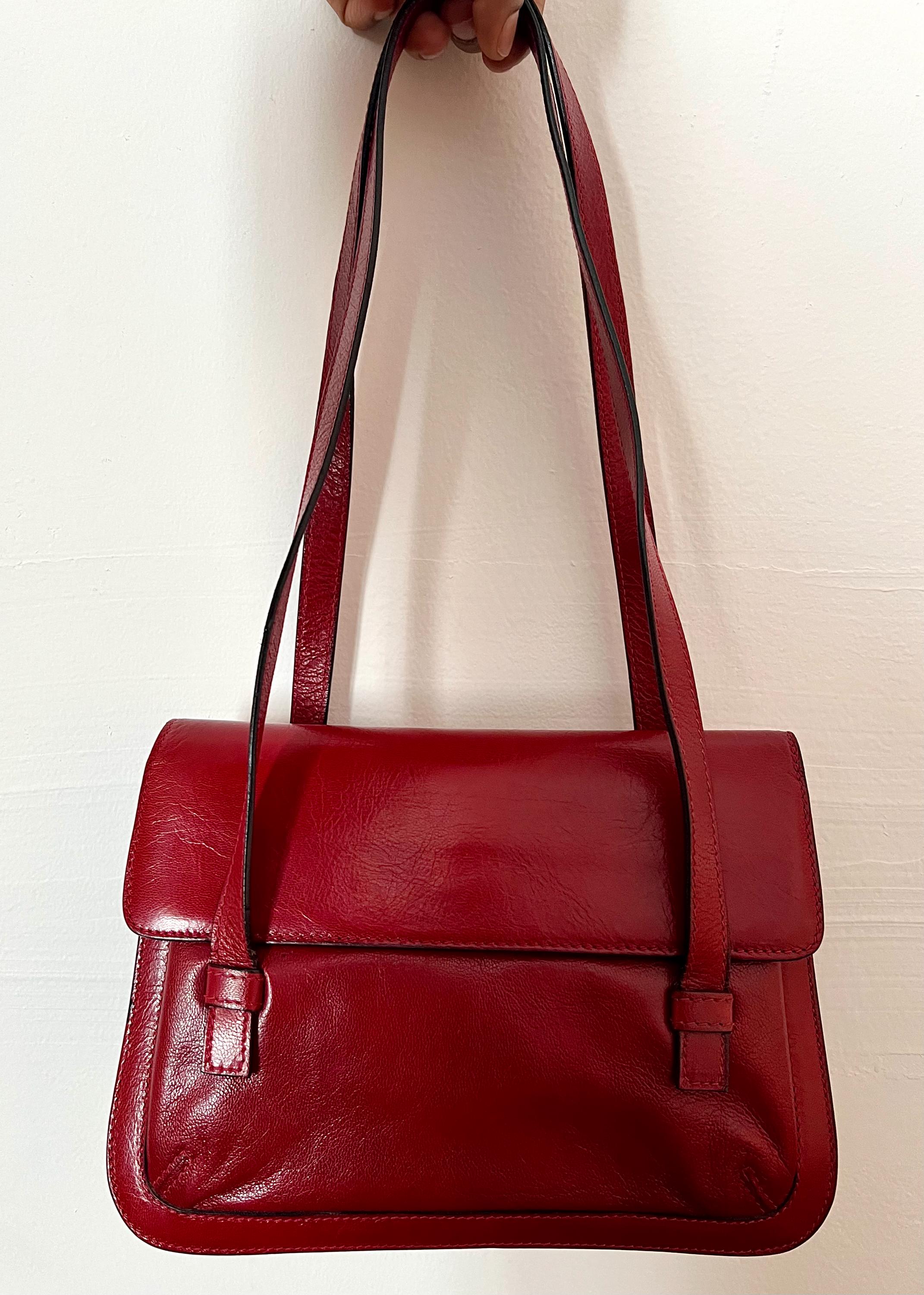 Elevate your everyday look with this vintage red leather shoulder bag, a timeless piece crafted in Italy from rich, supple leather. Its structured silhouette, fold-over flap, and long shoulder straps create an effortlessly chic profile that pairs beautifully with both casual and elevated outfits. Inside, a black-lined interior with a sip pocket keeps essentials organized, while magnetic snap closure offers easy, secure access. The deep oxblood tone gives quiet luxury energy, classic and endlessly wearable.