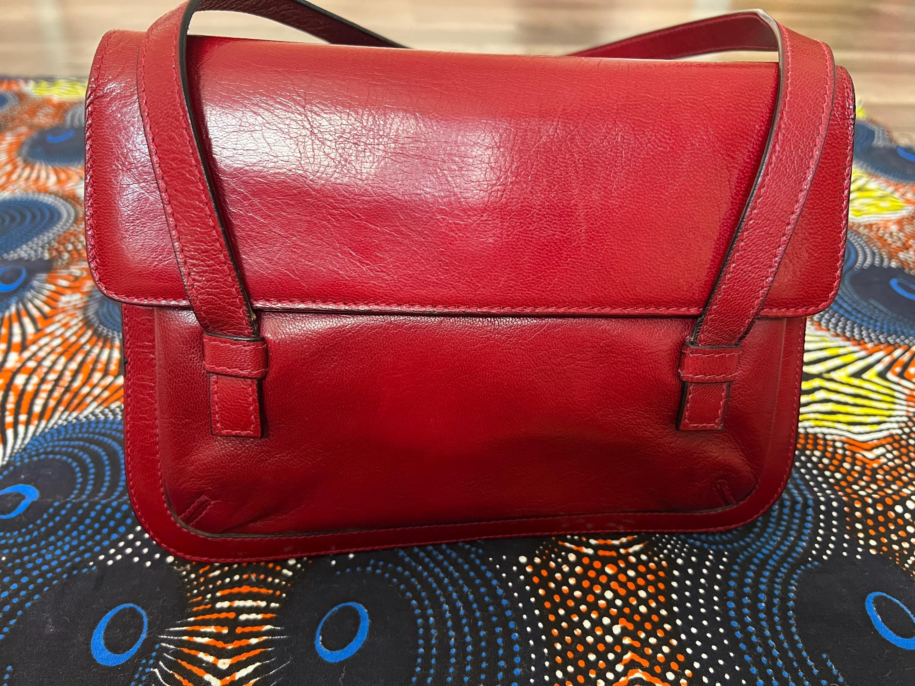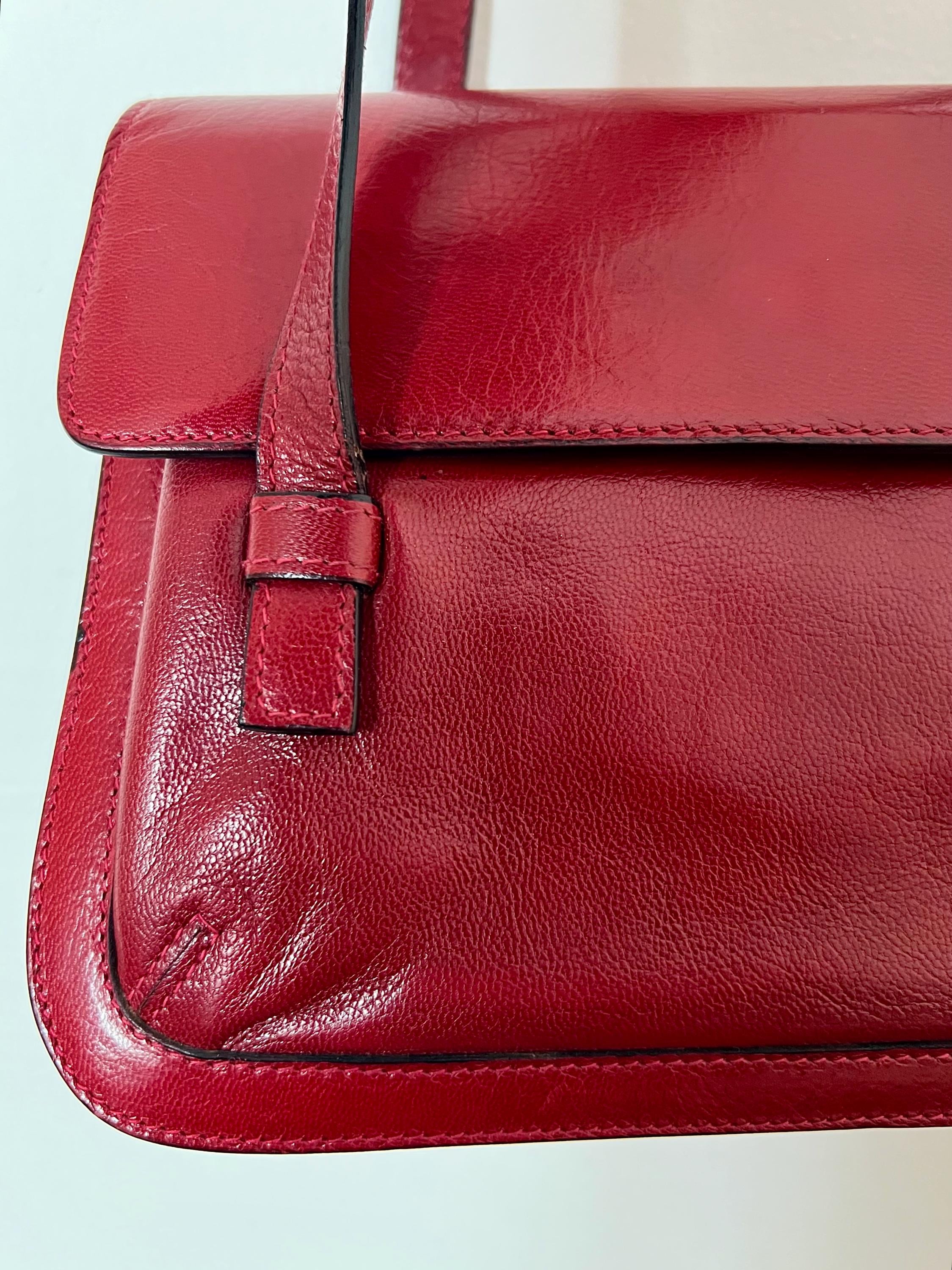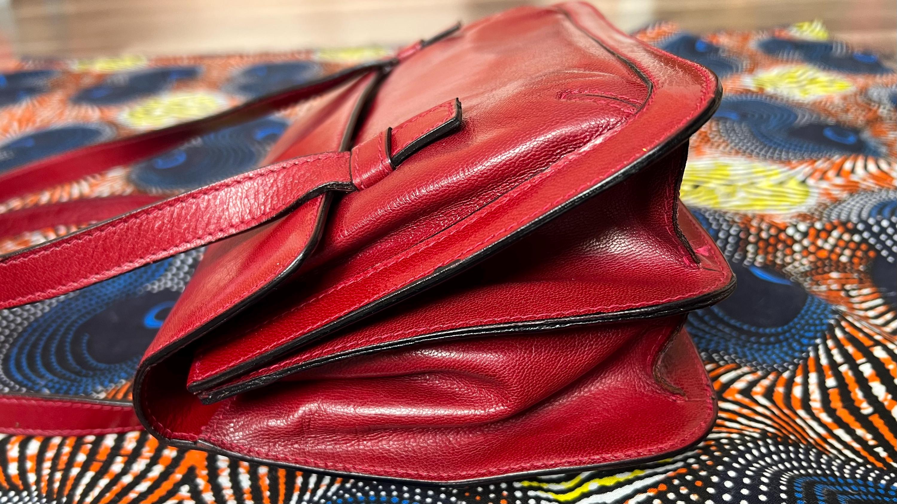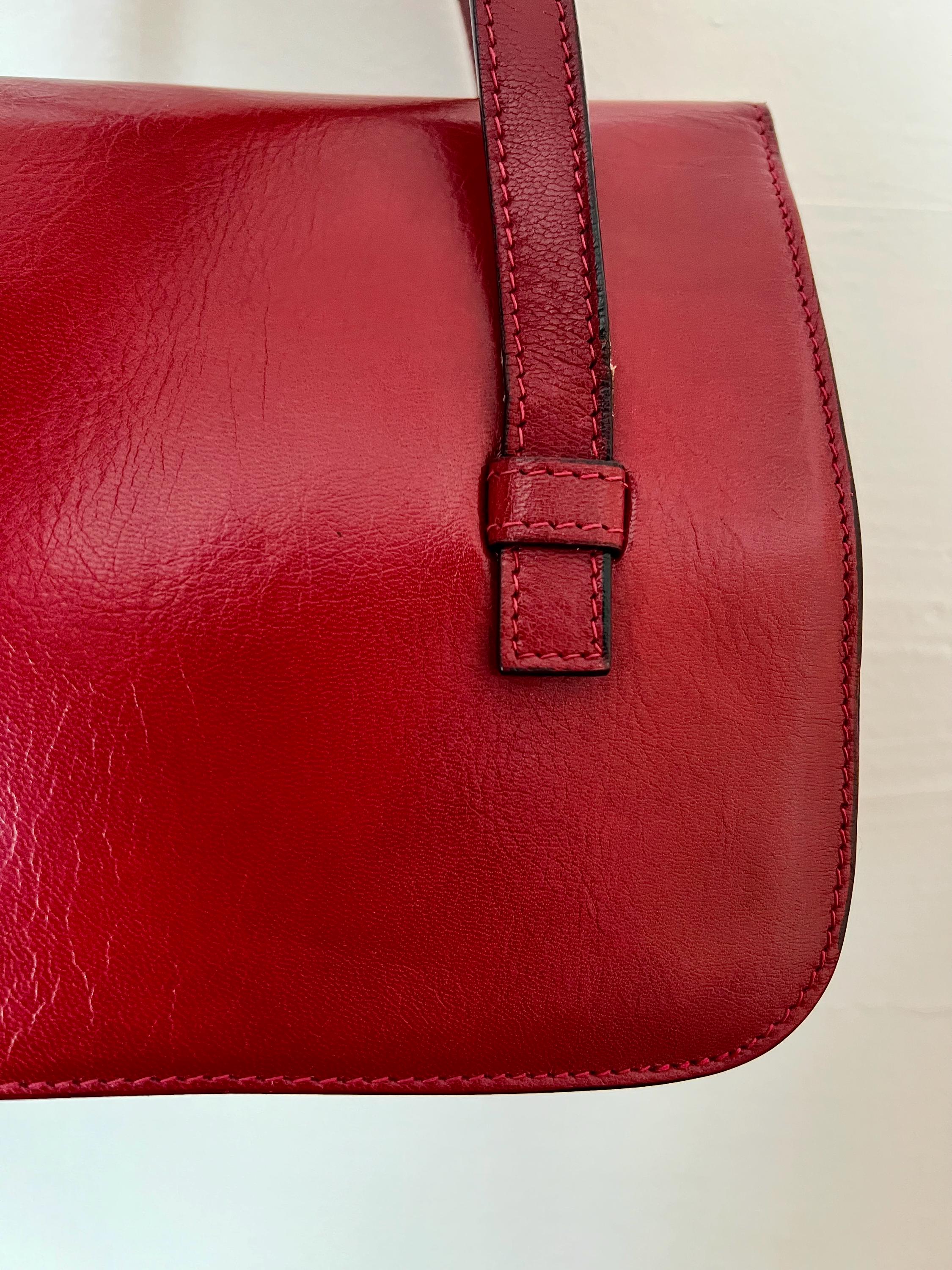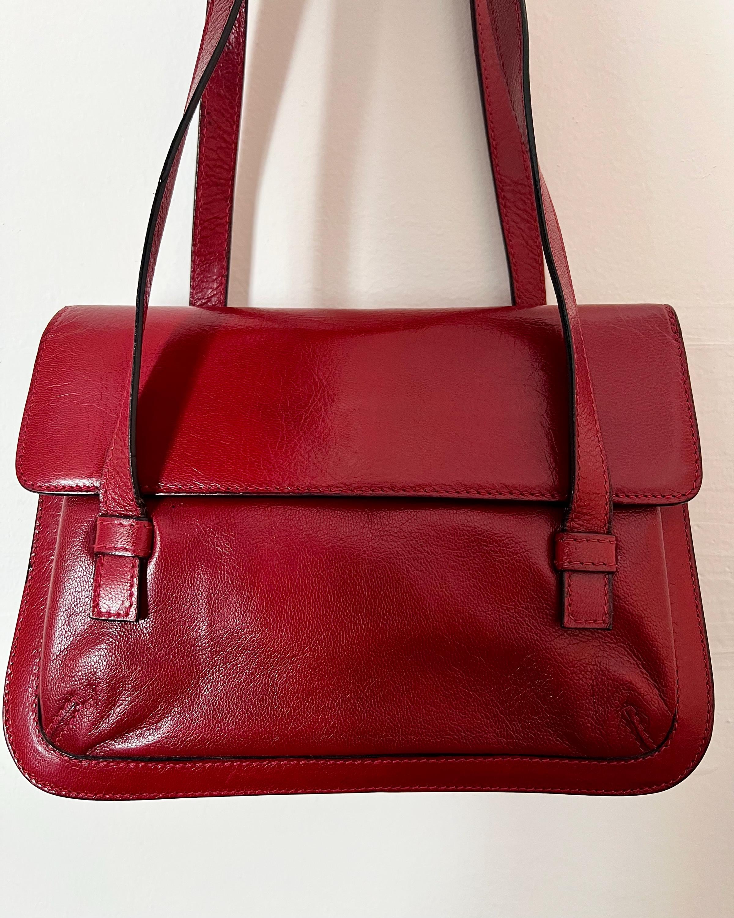 Elevate your everyday look with this vintage red leather shoulder bag, a timeless piece crafted in Italy from rich, supple leather. Its structured silhouette, fold-over flap, and long shoulder straps create an effortlessly chic profile that pairs beautifully with both casual and elevated outfits. Inside, a black-lined interior with a sip pocket keeps essentials organized, while magnetic snap closure offers easy, secure access. The deep oxblood tone gives quiet luxury energy, classic and endlessly wearable.