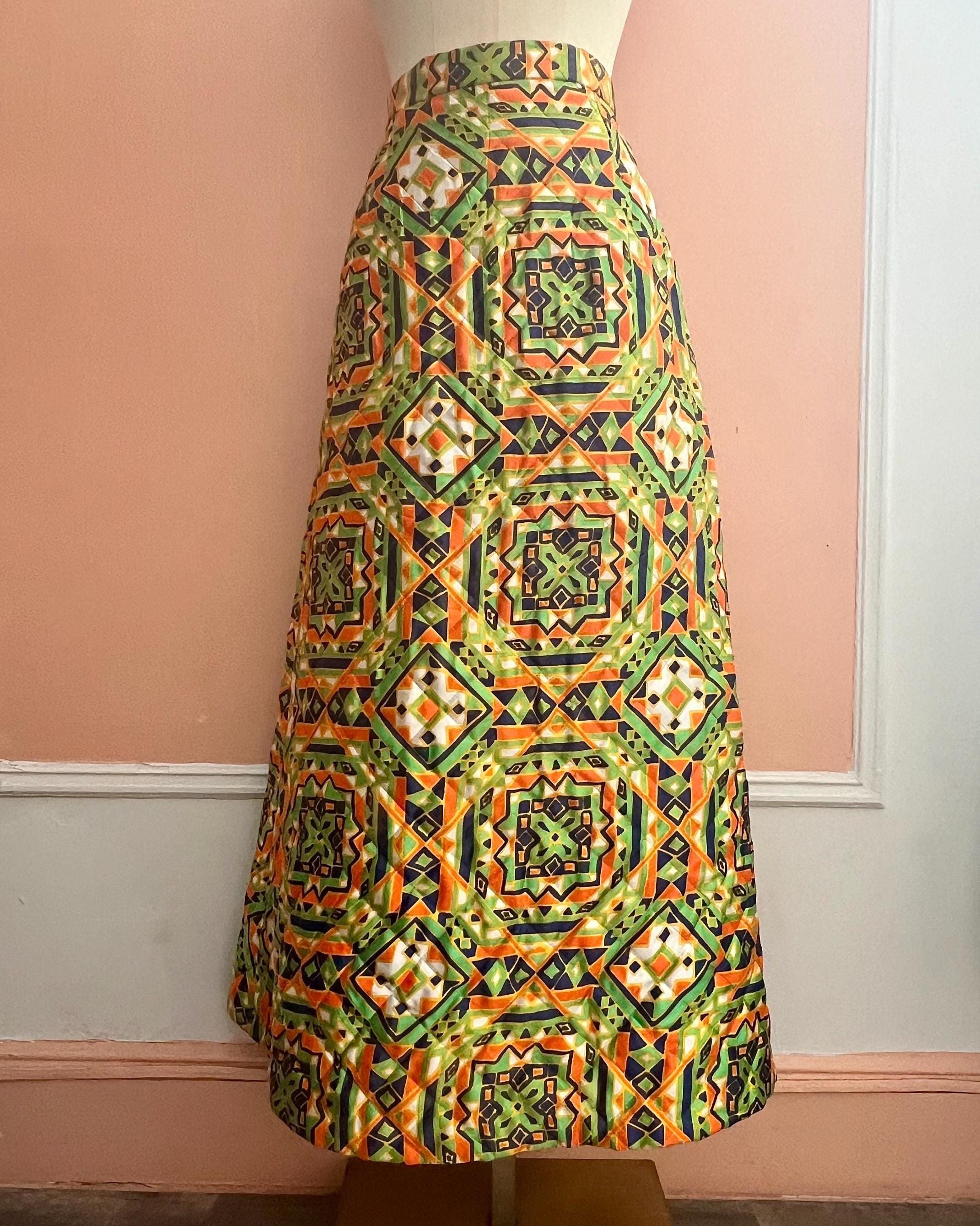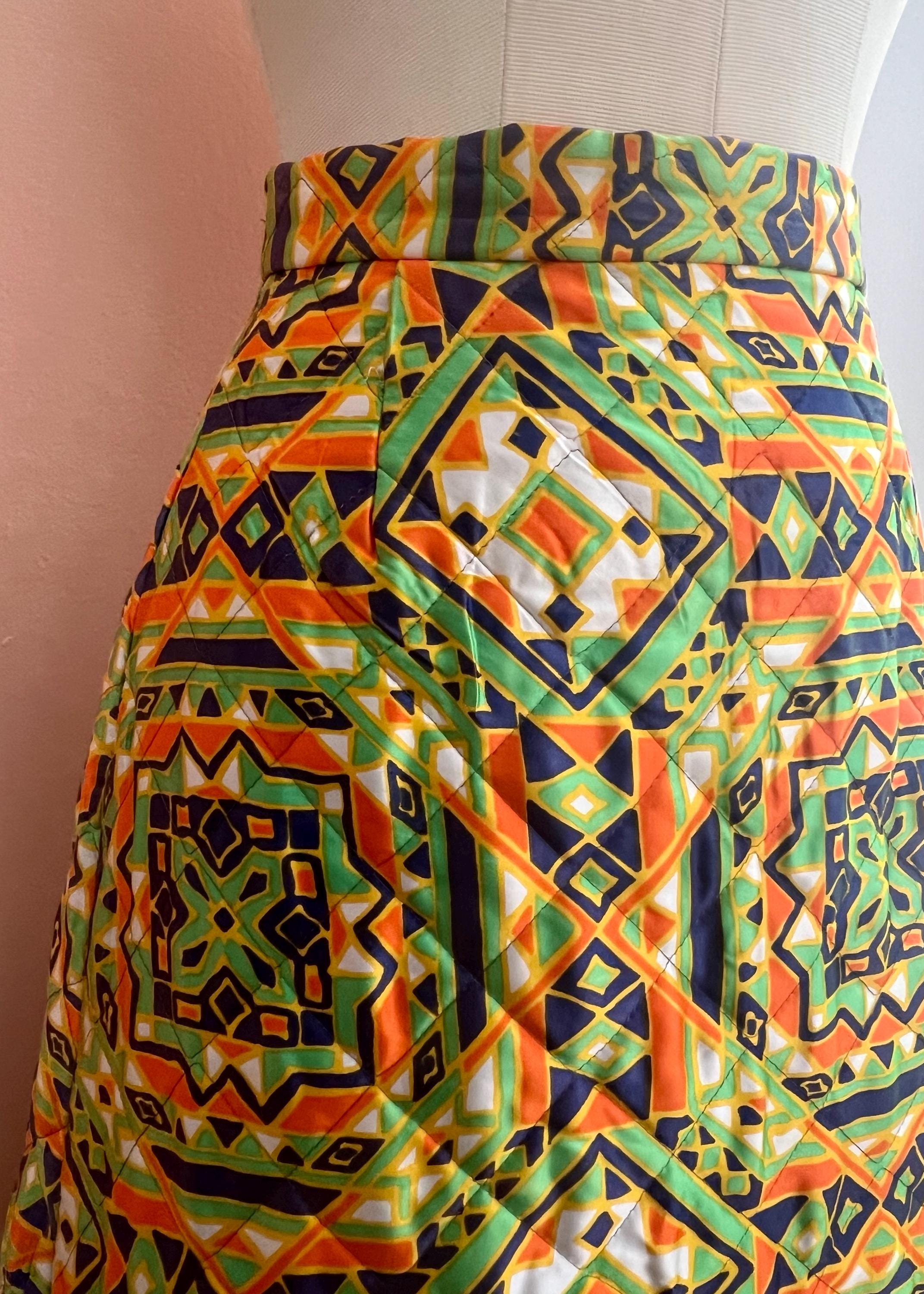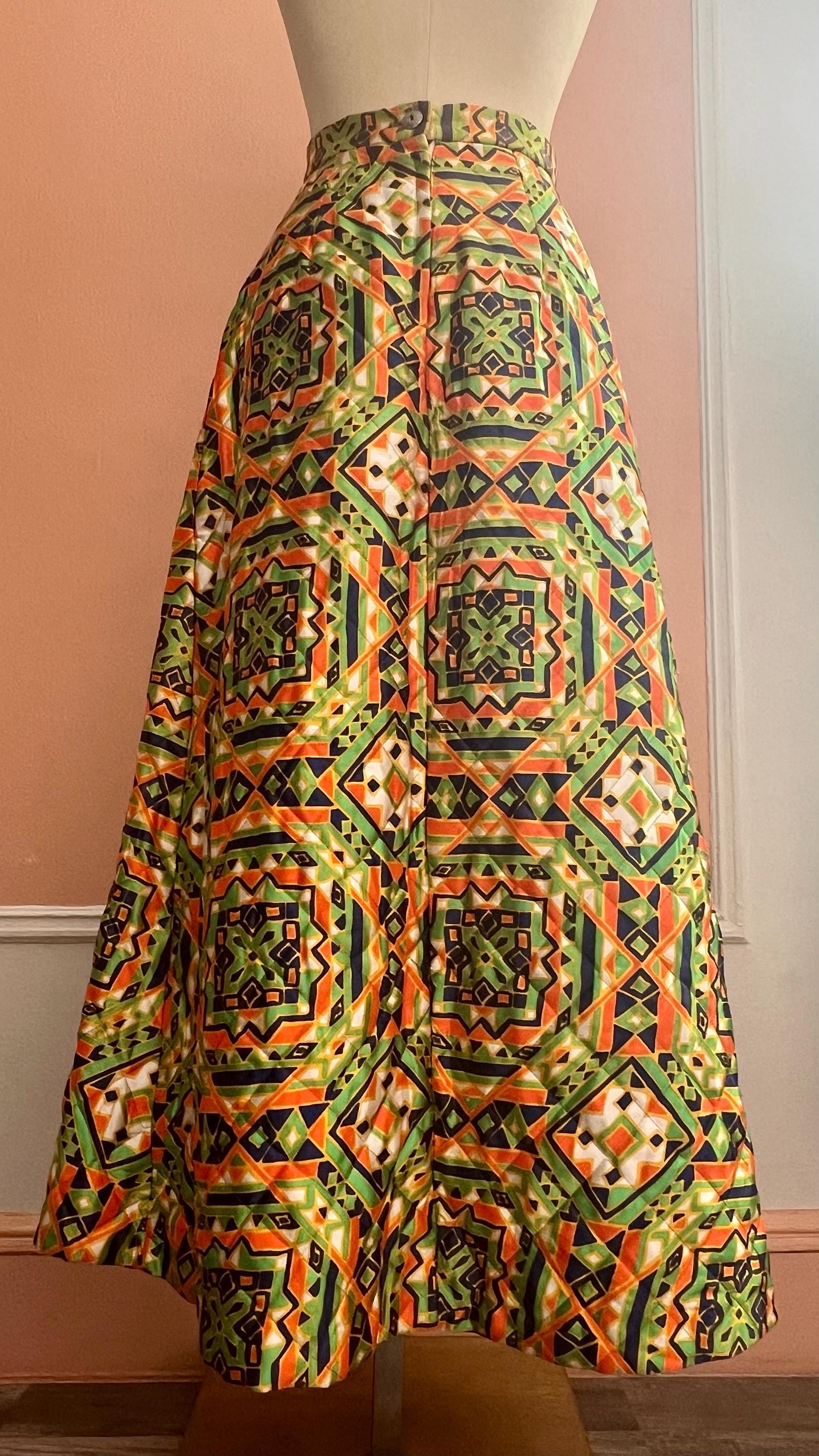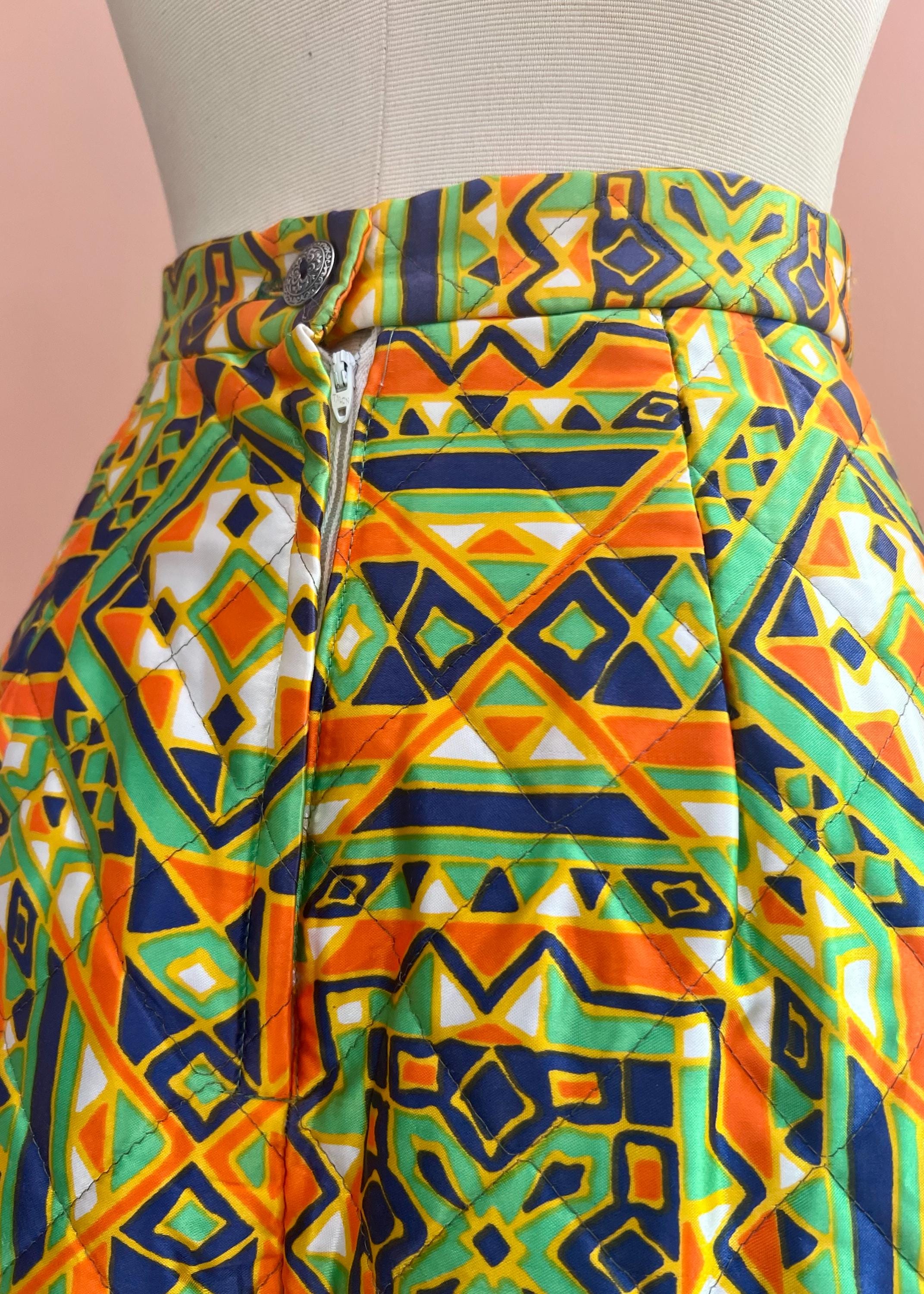 Vintage quilted skirt by Byer features a striking geometric print in vibrant green, orange, navy and cream tones. Designed with a high waist and flattering A-line silhouette, this piece captures the bold, artistic spirit of late 60s, 70s fashion. The quilted construction ads subtle structure and texture while remaining lightweight and comfortable for everyday wear. A standout statement piece that pairs effortlessly with simple knits, blouses, or tucked-in tees. Perfect for lovers of bohemian, mod, and folk-inspired vintage style.