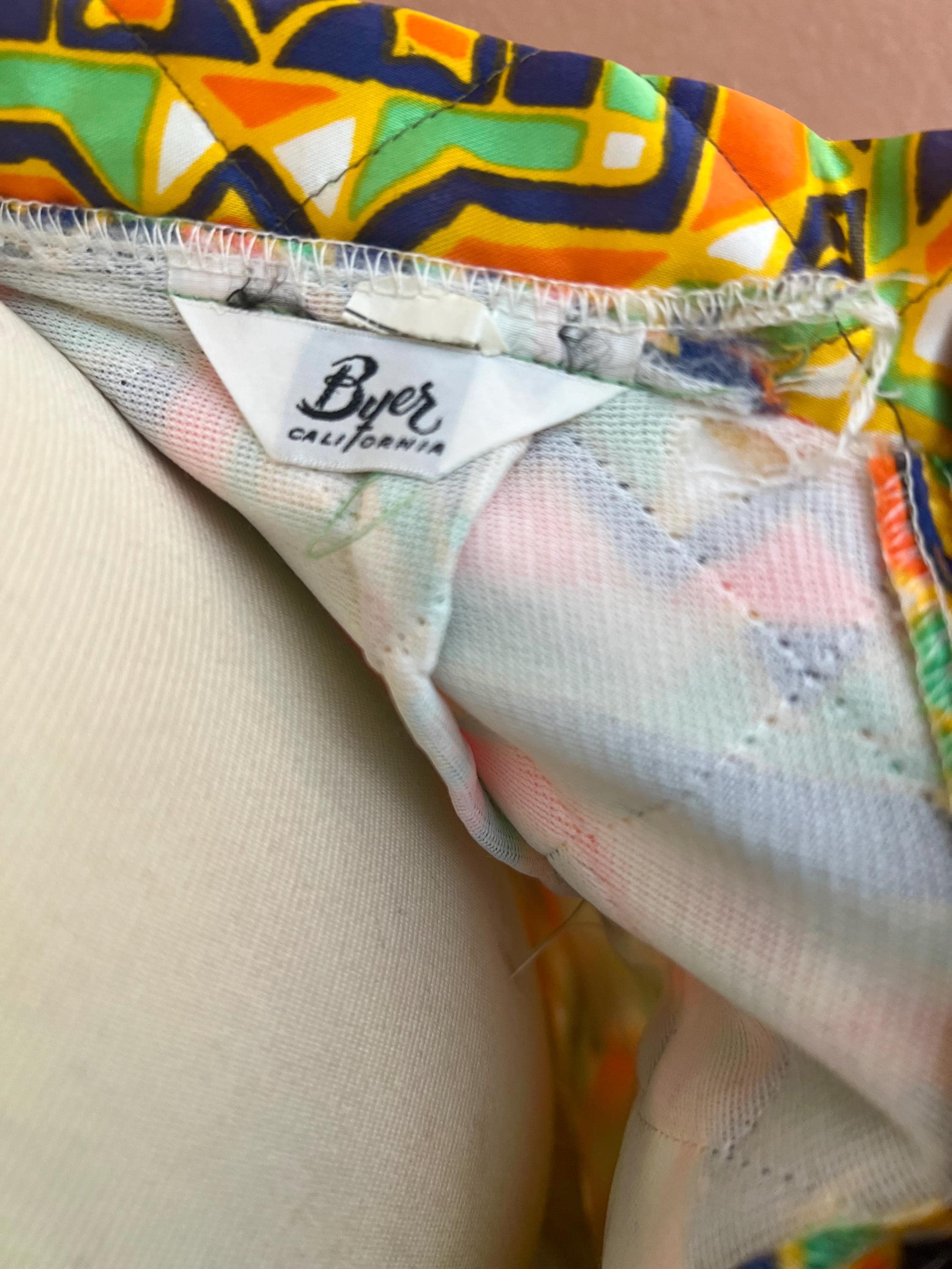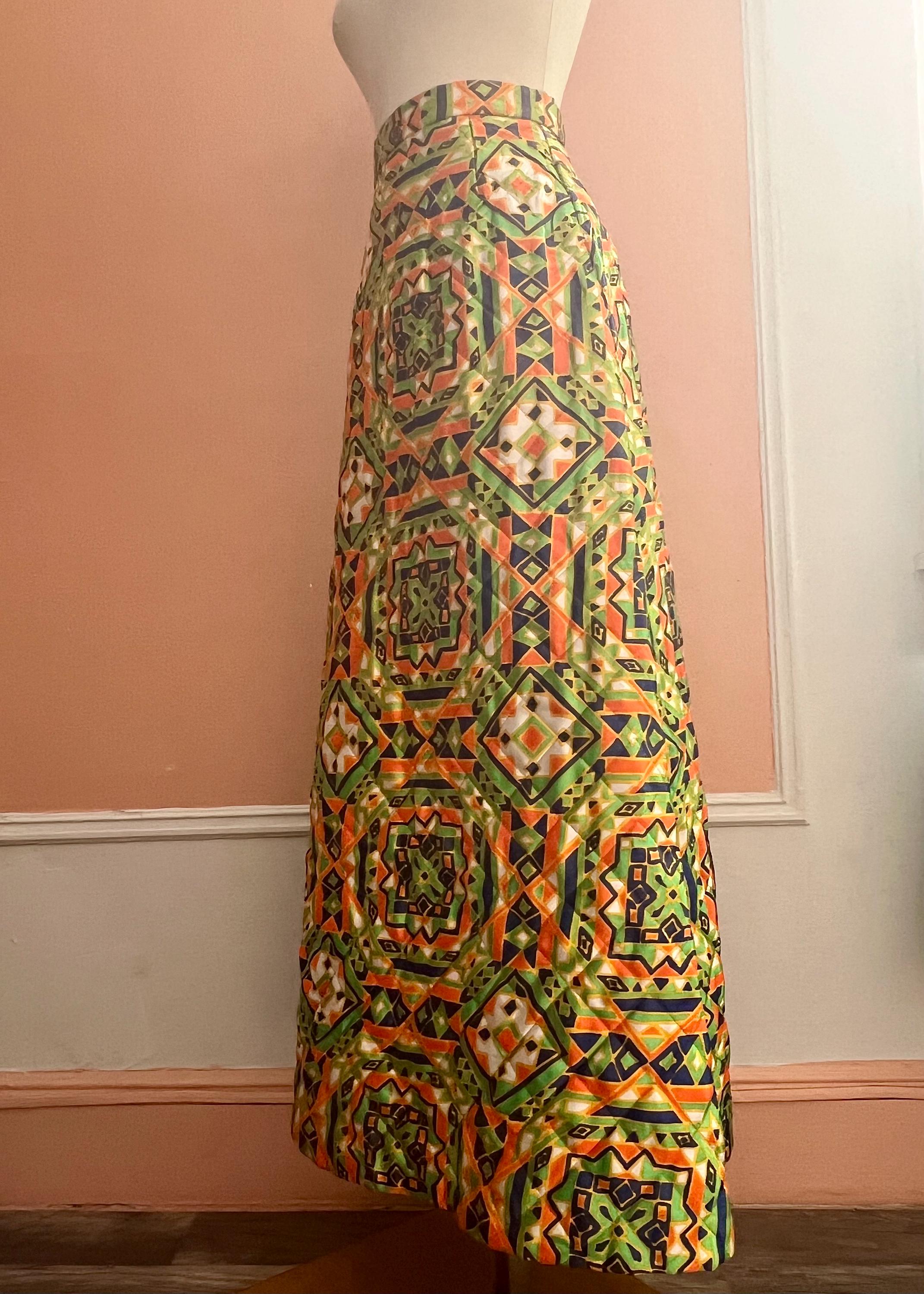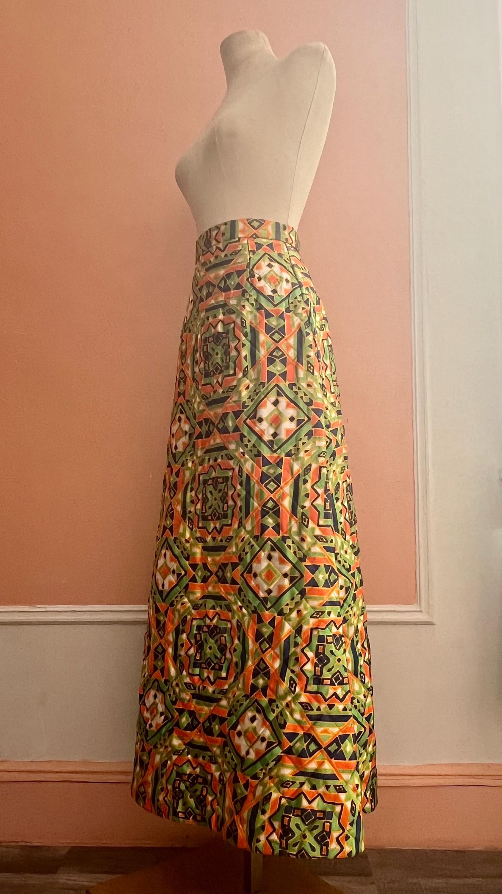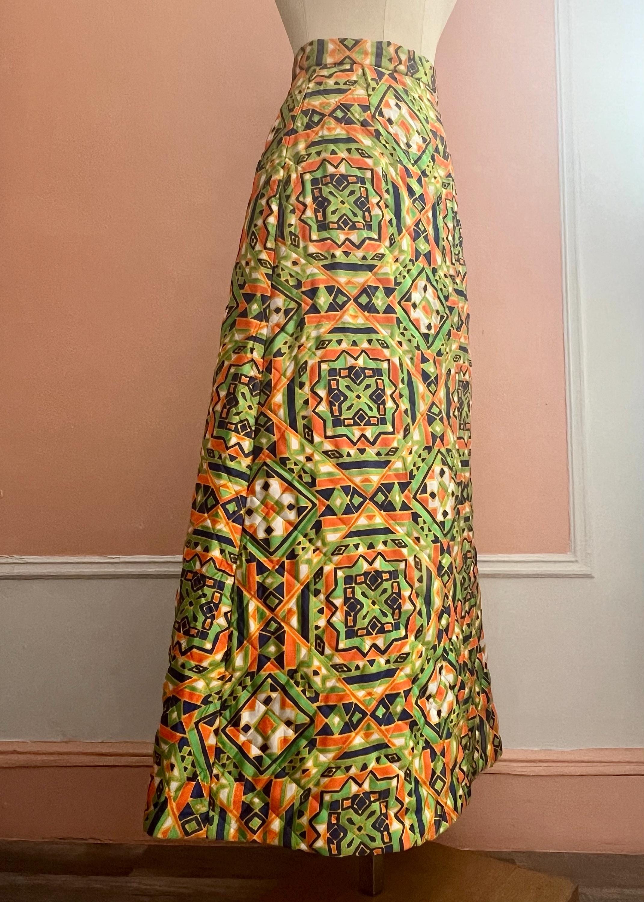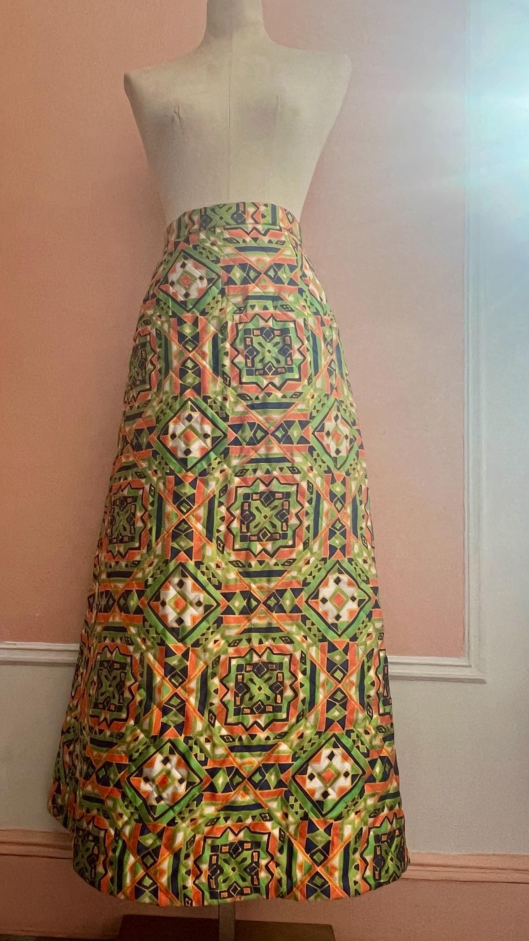 Vintage quilted skirt by Byer features a striking geometric print in vibrant green, orange, navy and cream tones. Designed with a high waist and flattering A-line silhouette, this piece captures the bold, artistic spirit of late 60s, 70s fashion. The quilted construction ads subtle structure and texture while remaining lightweight and comfortable for everyday wear. A standout statement piece that pairs effortlessly with simple knits, blouses, or tucked-in tees. Perfect for lovers of bohemian, mod, and folk-inspired vintage style.
