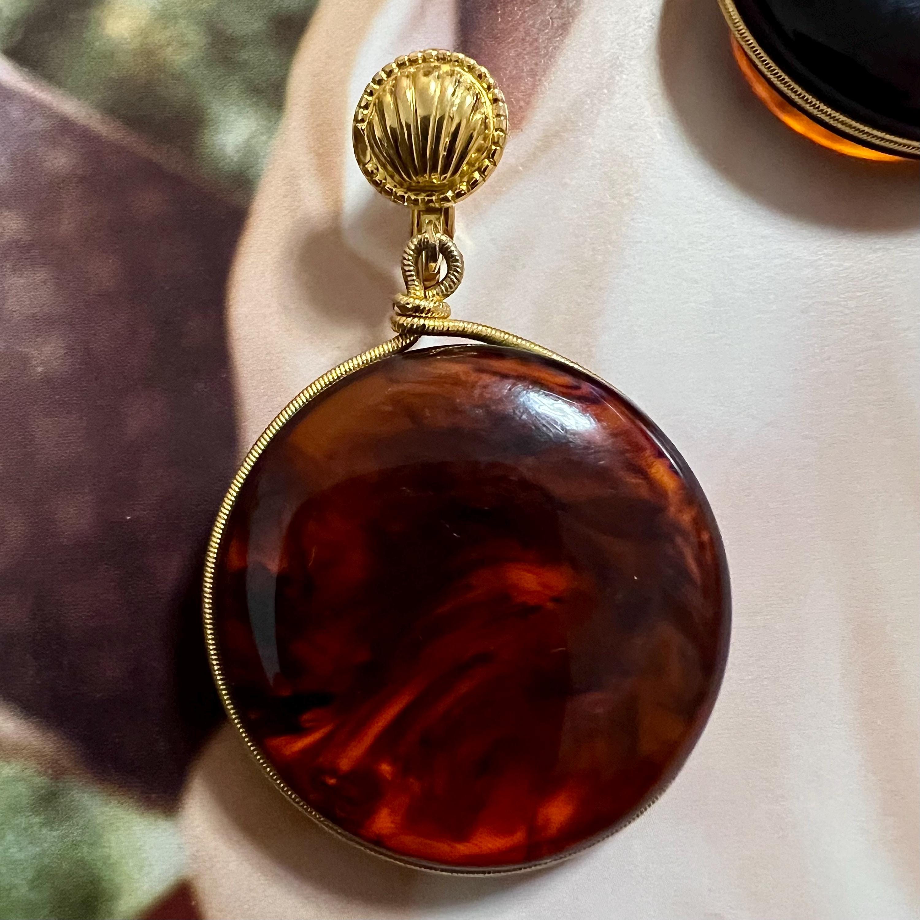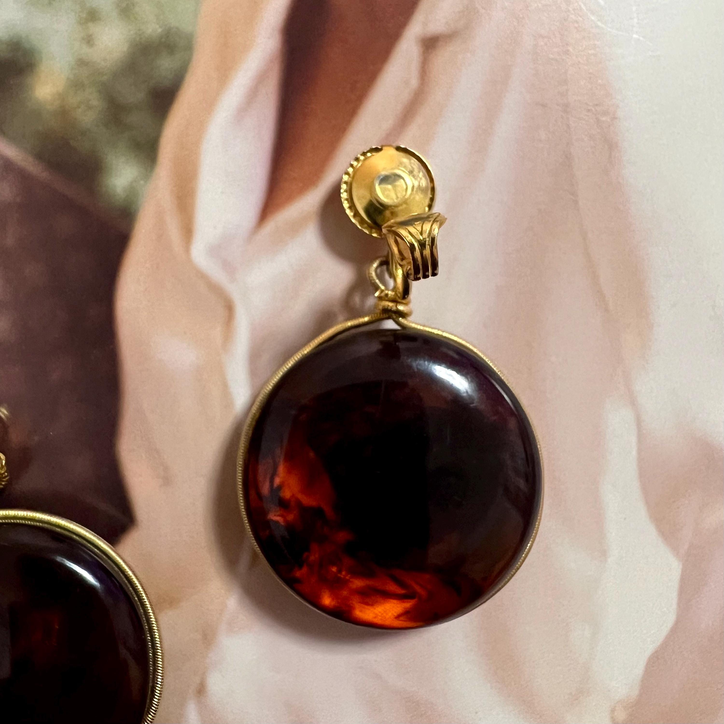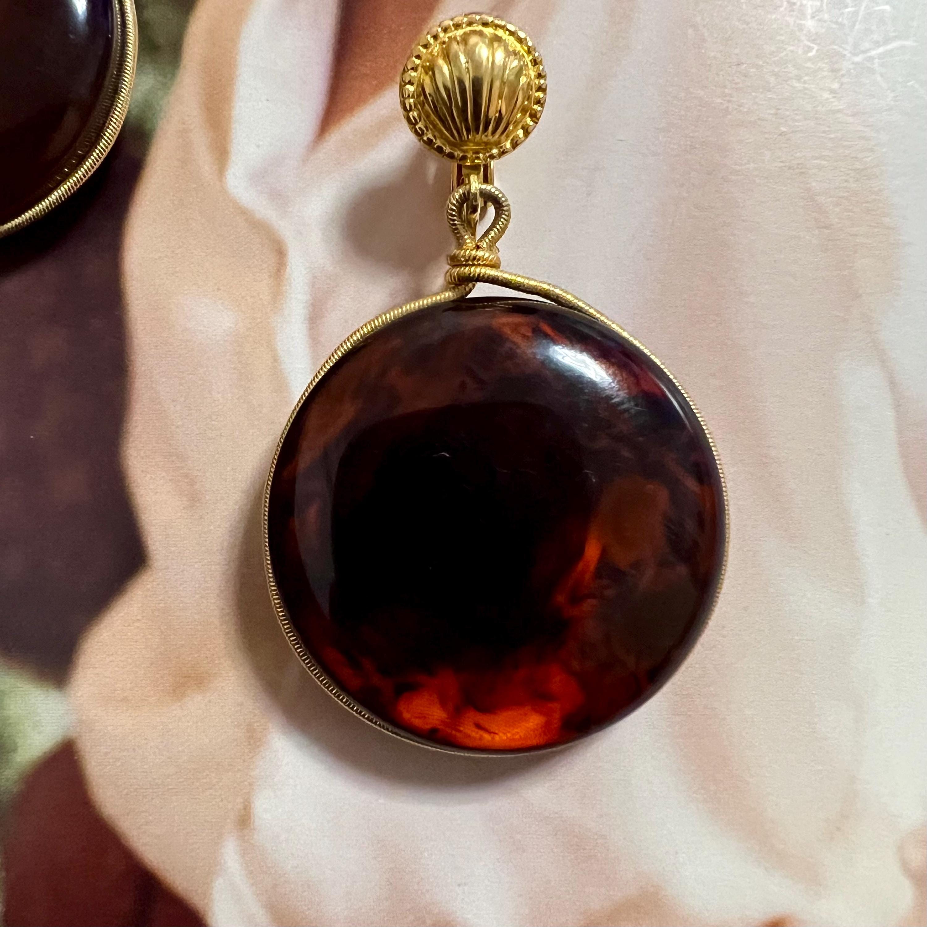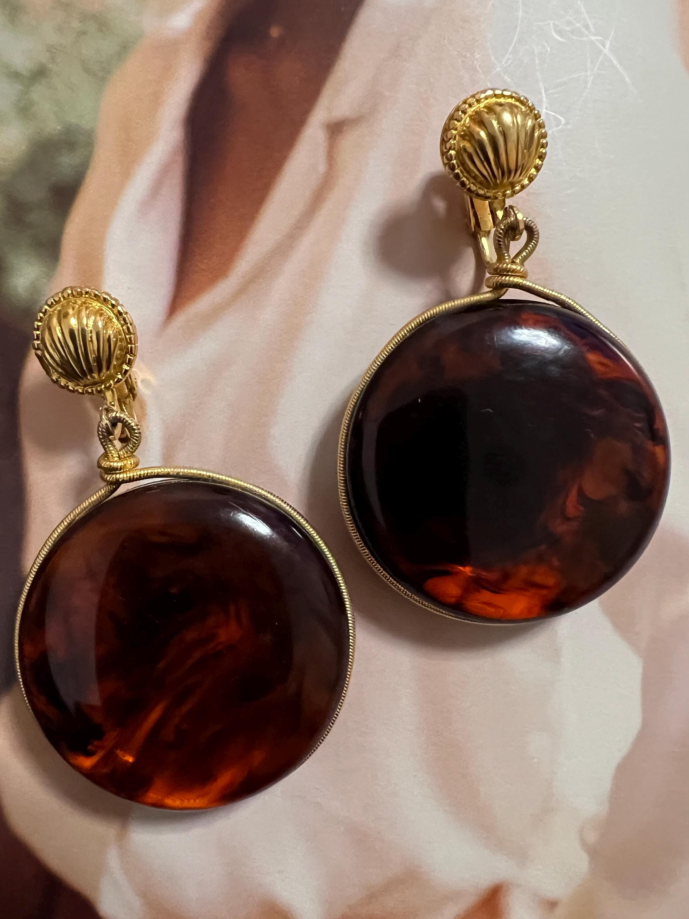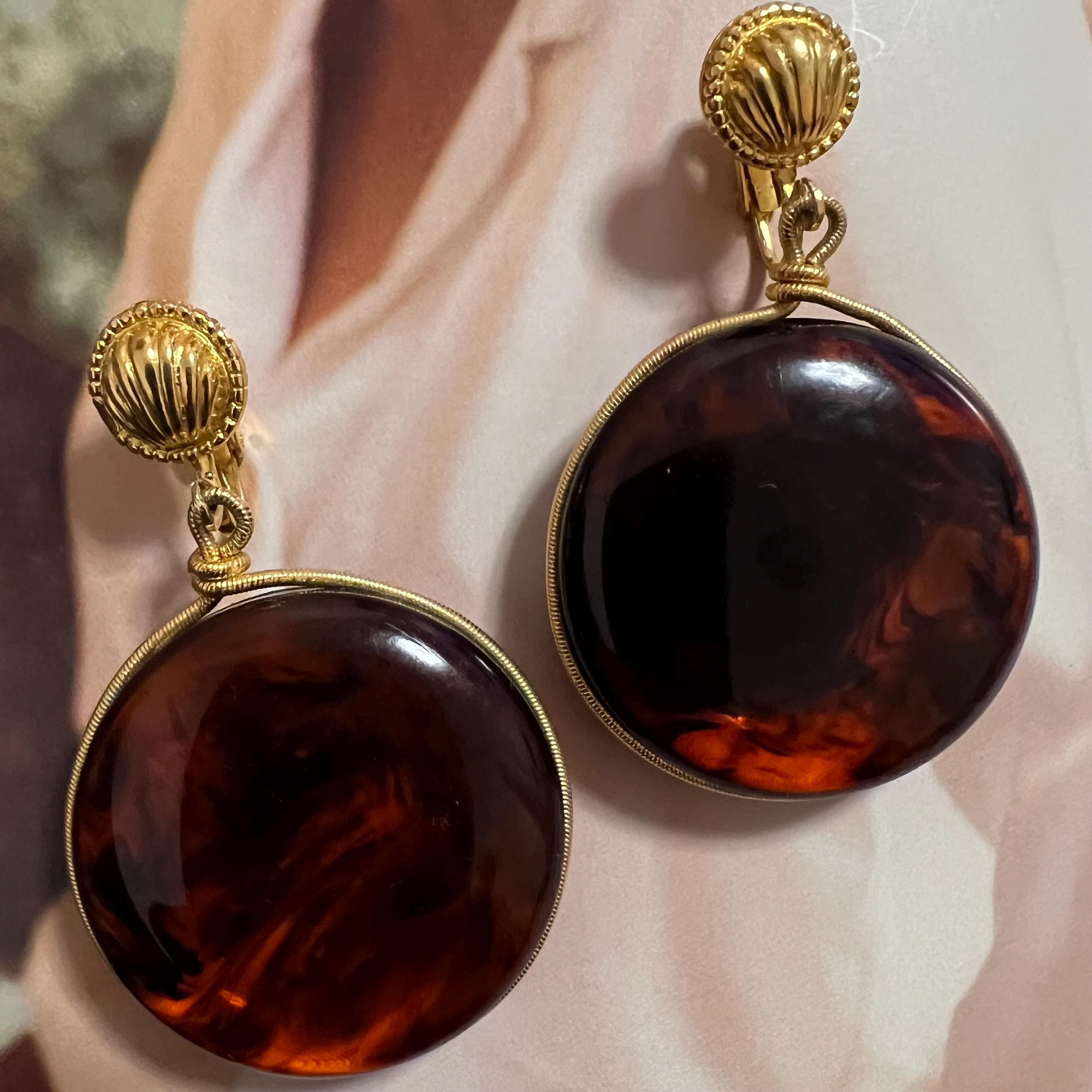 Fashionable Pair of Vintage Tortoise Shell Circular Clip On Drop Earrings. Style of earrings are echoing late 60s, early 70s bold glam. Features faux tortoiseshell lucite disk wrapped with twisted wire bezel setting and textured gold shell top. Clip-on drops measure 2.5 inches in length, with elegant movement. Boho chic meets disco refinement. These beauties have been well cared for, and are in great vintage condition with age.